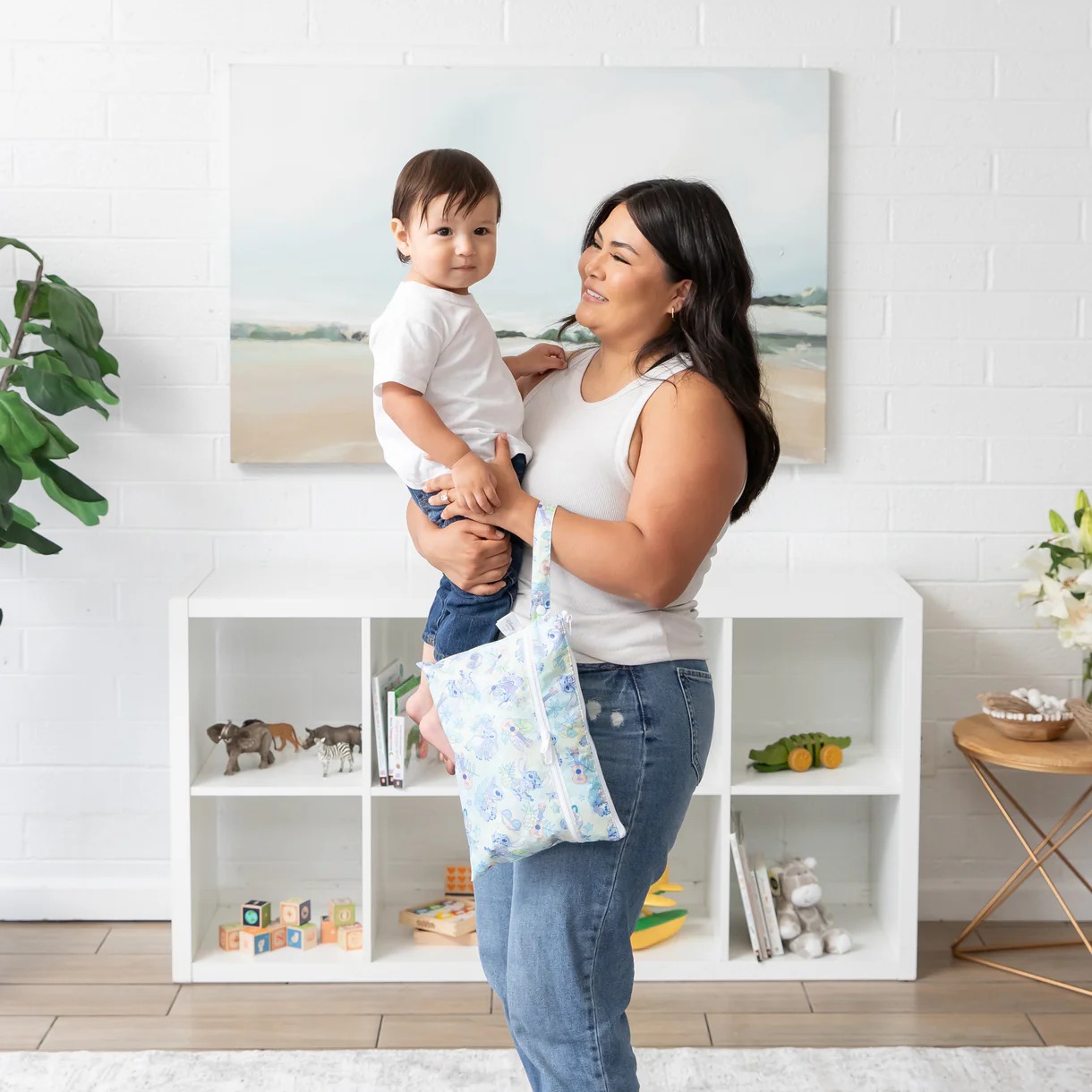 Votre nouvel indispensable pour vos déplacements est arrivé ! La pochette réutilisable imperméable/étanche de Bumkins a tout ce que vous aimez dans le sac imperméable/étanche classique, mais dans un format compact, à emporter. La pochette est dotée du même tissu imperméable que notre SuperBib et de coutures thermosoudées pour une véritable protection imperméable. Deux compartiments à fermeture à glissière permettent de séparer les articles secs des articles mouillés. Grâce à la construction monocouche, vous n'avez pas à vous soucier de la prolifération d'éléments dégoûtants entre les couches de tissu. Les pochettes Wet/Dry font d'excellents sacs à langer compacts et peuvent également contenir des vêtements sales et des maillots de bain mouillés. Ces sacs sont d'excellents organisateurs pour les jouets, les accessoires, les articles de toilette, les appareils électroniques, les voyages et bien plus encore ! Avec une poignée à pression, vous pouvez accrocher votre sac là où vous en avez besoin - poussette, table à langer ou valise. Les sacs ne comportent pas de soufflets, ne sont pas isolés et ne sont pas extensibles.