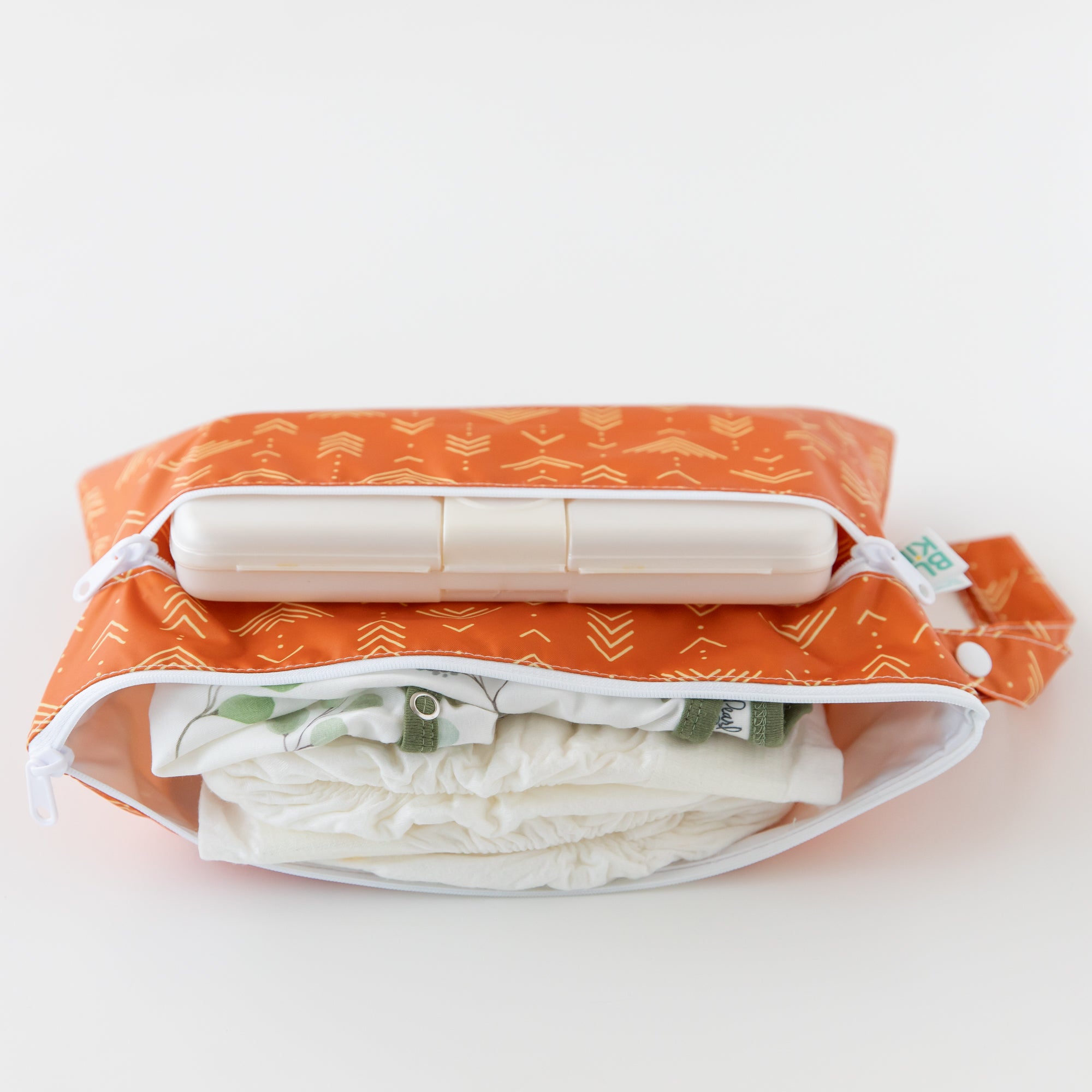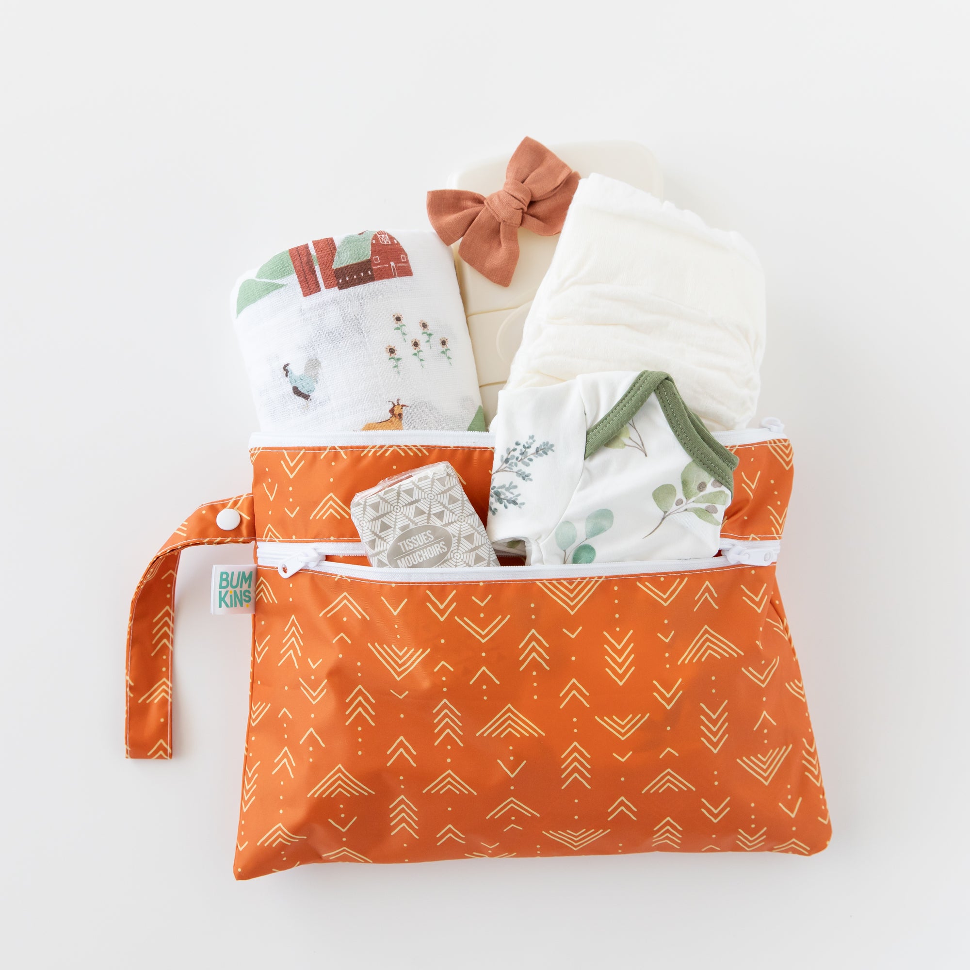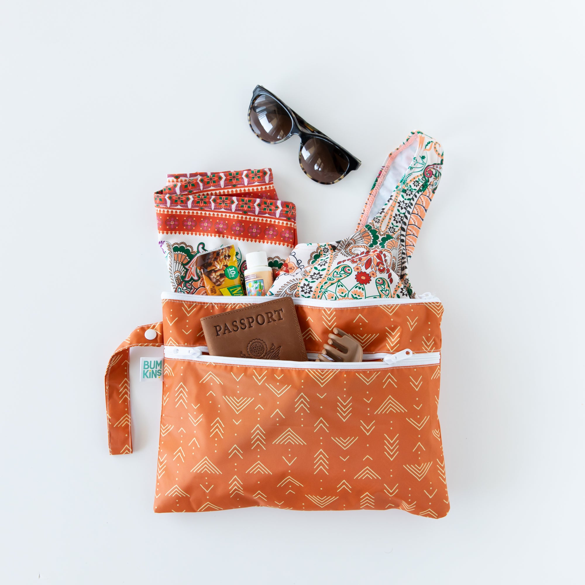 Votre nouvel indispensable pour vos déplacements est arrivé ! La pochette réutilisable imperméable/étanche de Bumkins a tout ce que vous aimez dans le sac imperméable/étanche classique, mais dans un format compact, à emporter. La pochette est dotée du même tissu imperméable que notre SuperBib et de coutures thermosoudées pour une véritable protection imperméable. Deux compartiments à fermeture à glissière permettent de séparer les articles secs des articles mouillés. Grâce à la construction monocouche, vous n'avez pas à vous soucier de la prolifération d'éléments dégoûtants entre les couches de tissu. Les pochettes Wet/Dry font d'excellents sacs à langer compacts et peuvent également contenir des vêtements sales et des maillots de bain mouillés. Ces sacs sont d'excellents organisateurs pour les jouets, les accessoires, les articles de toilette, les appareils électroniques, les voyages et bien plus encore ! Avec une poignée à pression, vous pouvez accrocher votre sac là où vous en avez besoin - poussette, table à langer ou valise. Les sacs ne comportent pas de soufflets, ne sont pas isolés et ne sont pas extensibles.