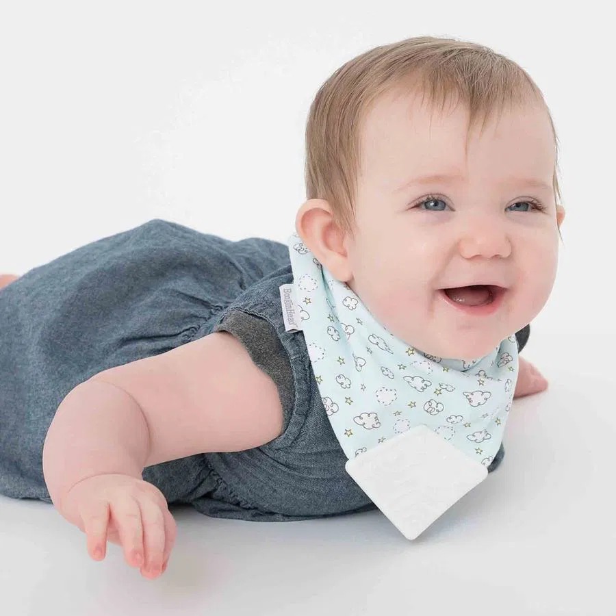 Zacht, superabsorberend katoen, aantrekkelijke trendy patronen en een voedselveilige siliconen bijtring die handig aan het uiteinde van de bandana is bevestigd, zorgen voor een stijlvol, functioneel en duurzaam slabbetje dat qua kwaliteit en comfort een stapje boven de rest uitsteekt.