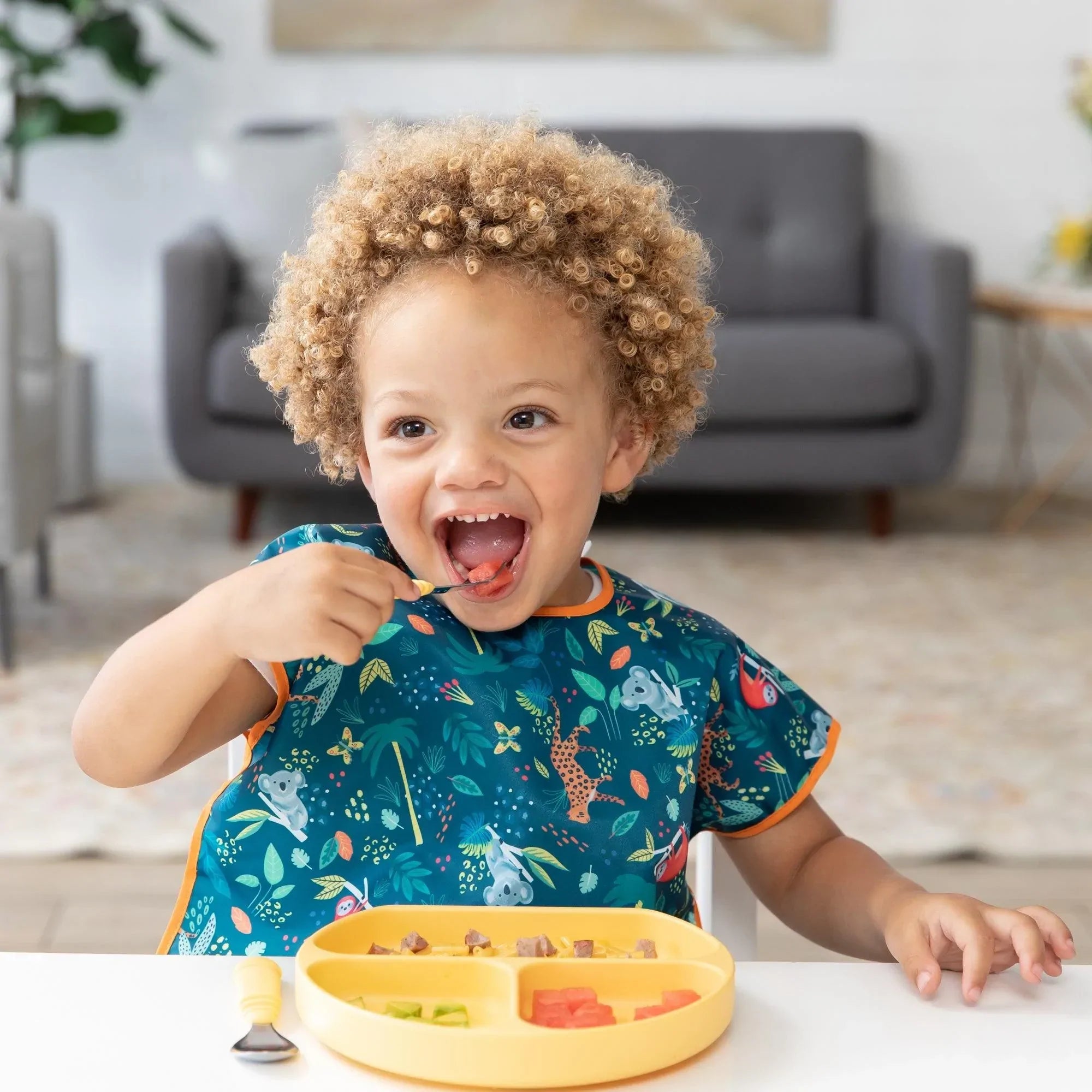 Your child won’t realize they’re wearing a bib as they slip on this short-sleeved toddler bib that features a large catch-all pocket to help contain spills, crumbs, and more. The back hook-and-loop closure allows for a quick, adjustable, and tug-proof fit. Wipeable and machine washable for easy cleaning so you can use it over and over again!
