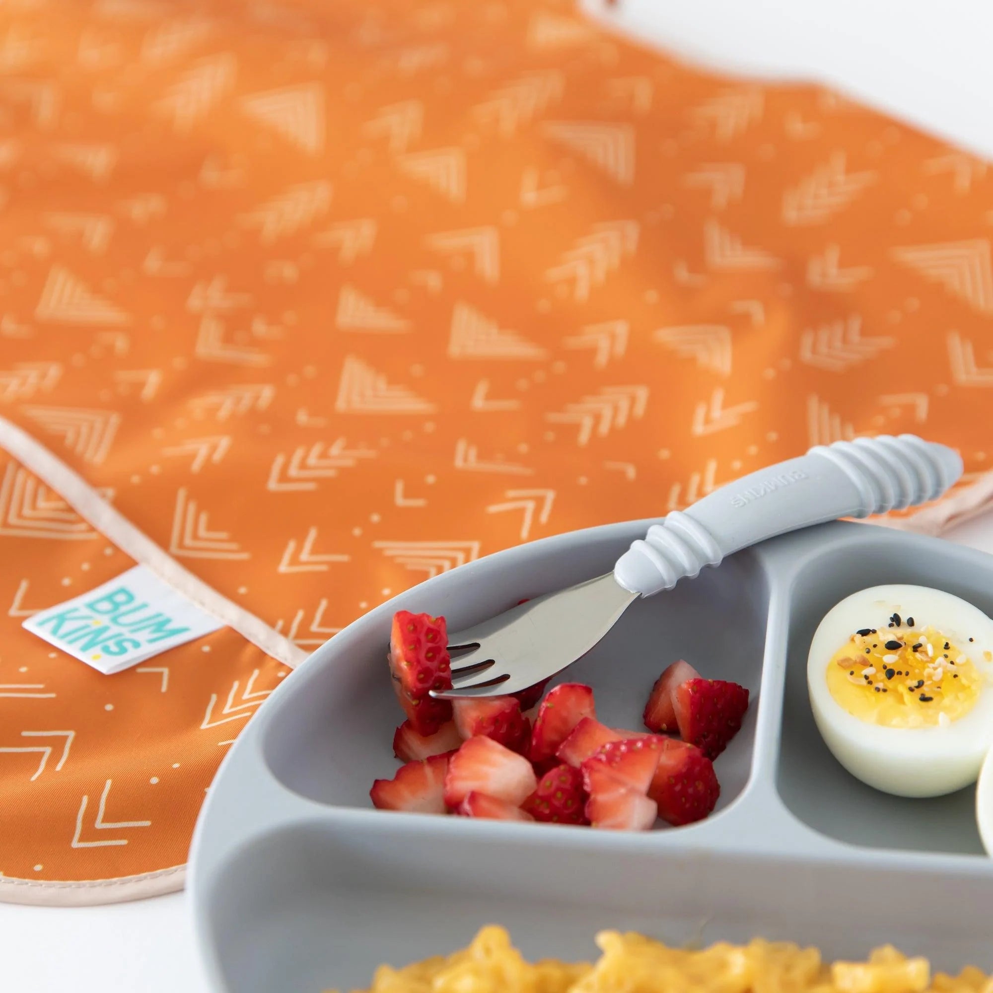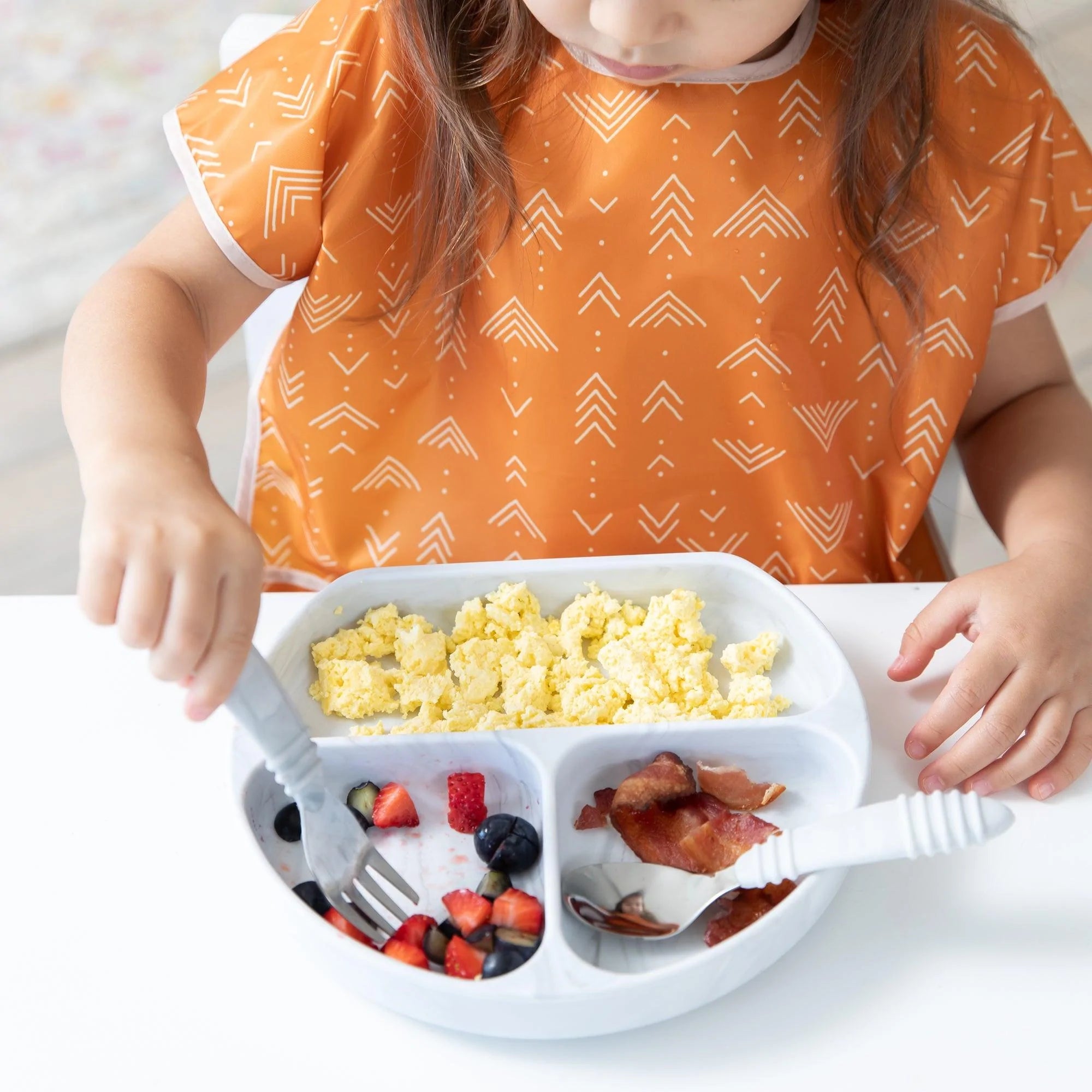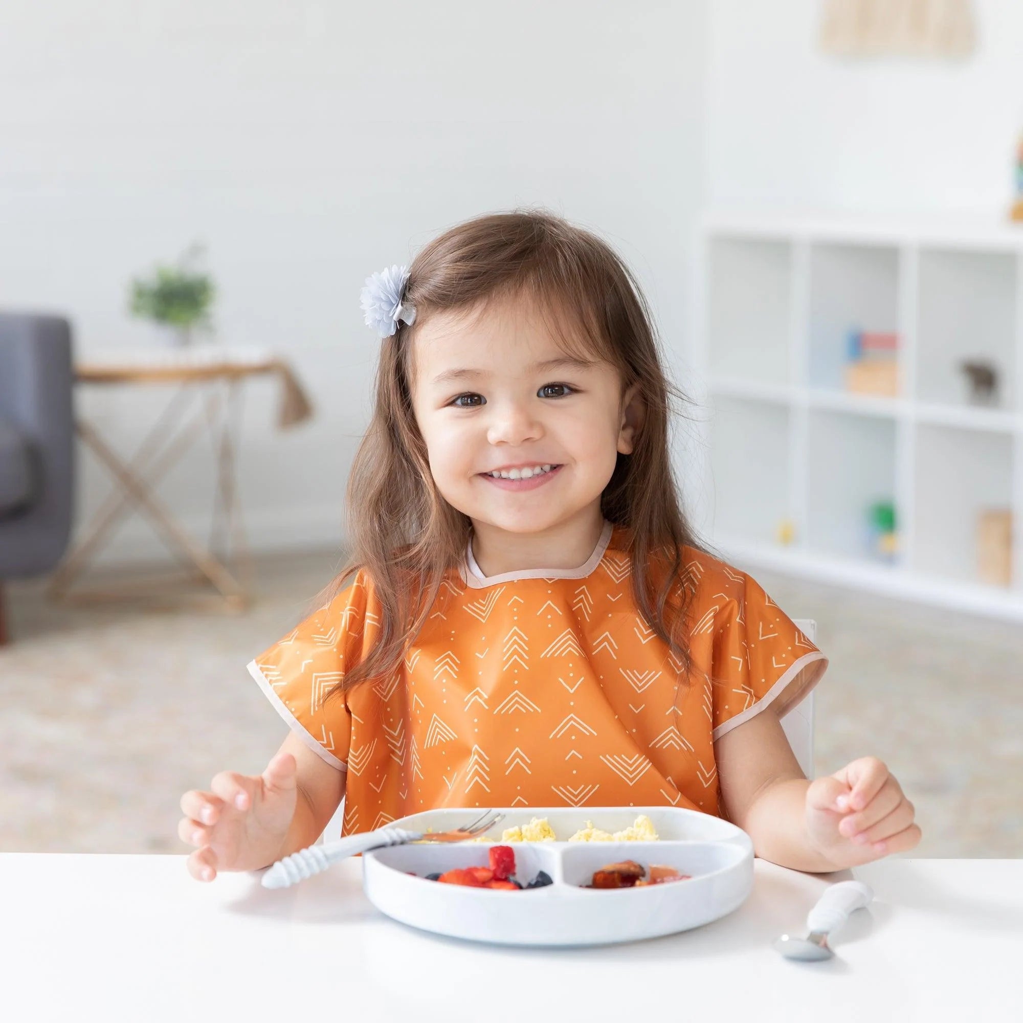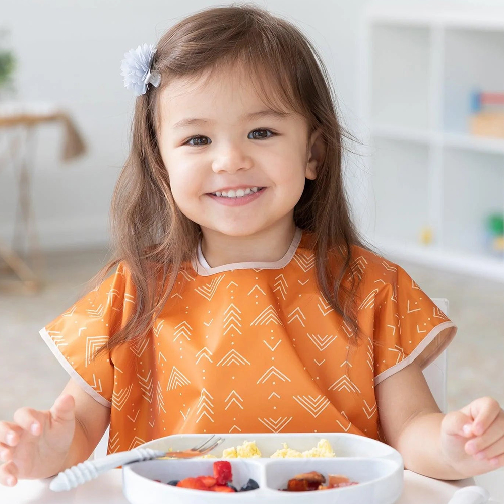 Your child won’t realize they’re wearing a bib as they slip on this short-sleeved toddler bib that features a large catch-all pocket to help contain spills, crumbs, and more. The back hook-and-loop closure allows for a quick, adjustable, and tug-proof fit. Wipeable and machine washable for easy cleaning so you can use it over and over again!
