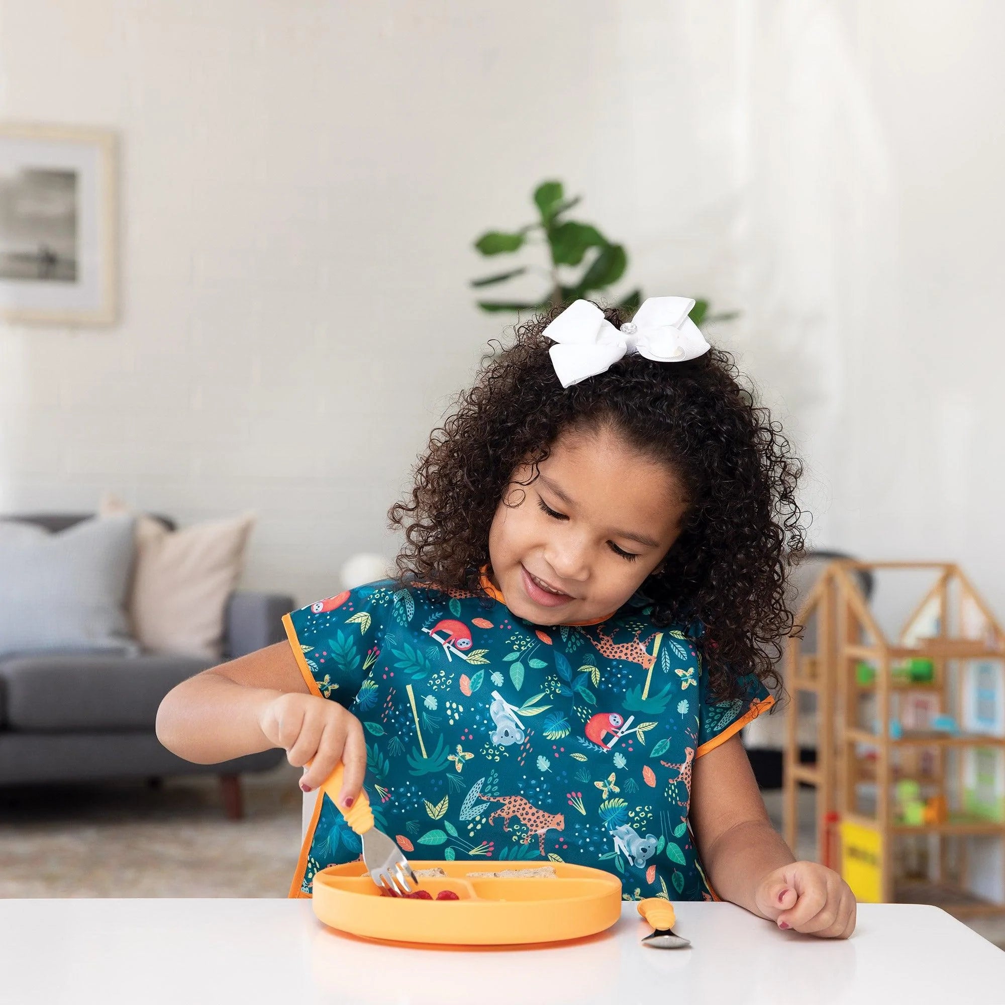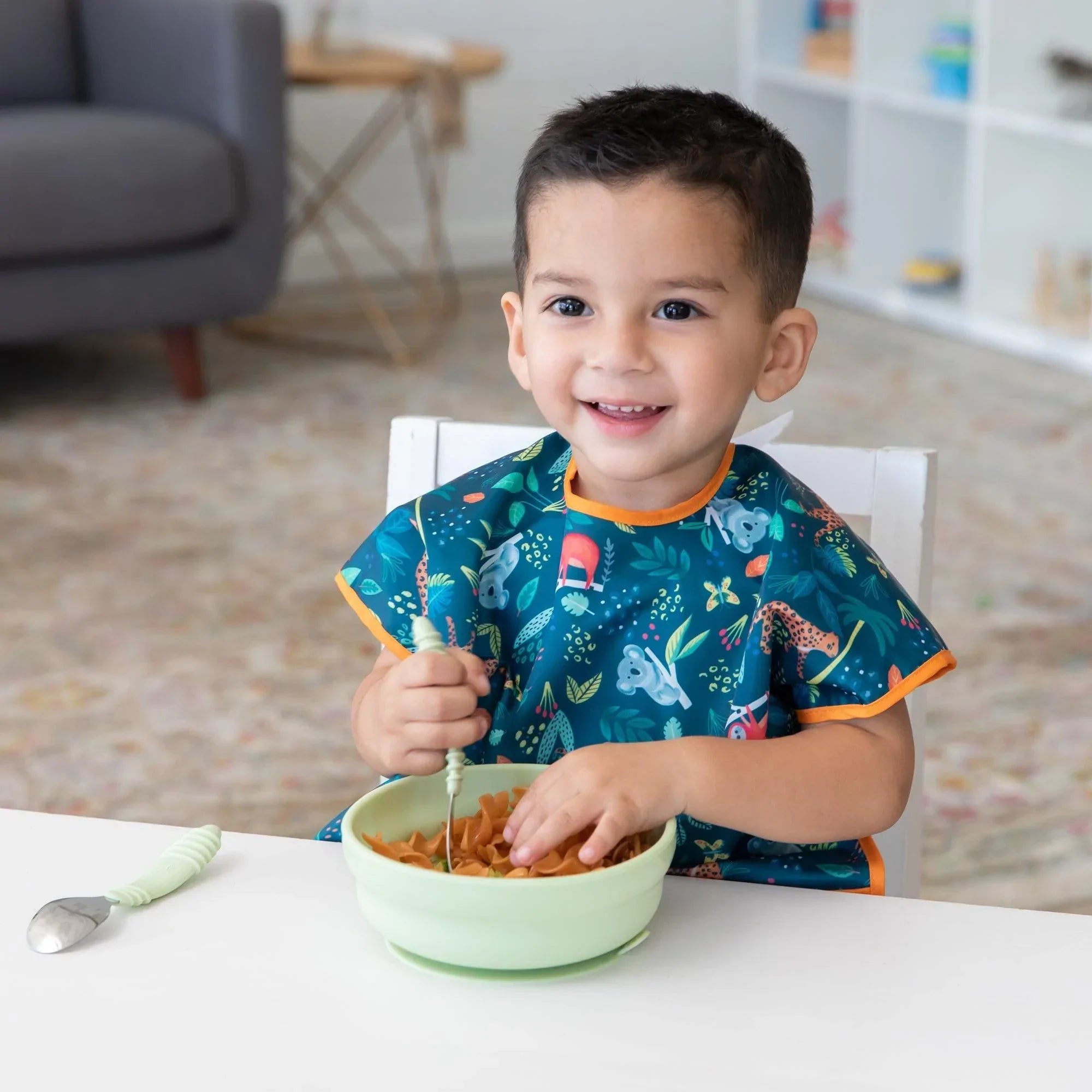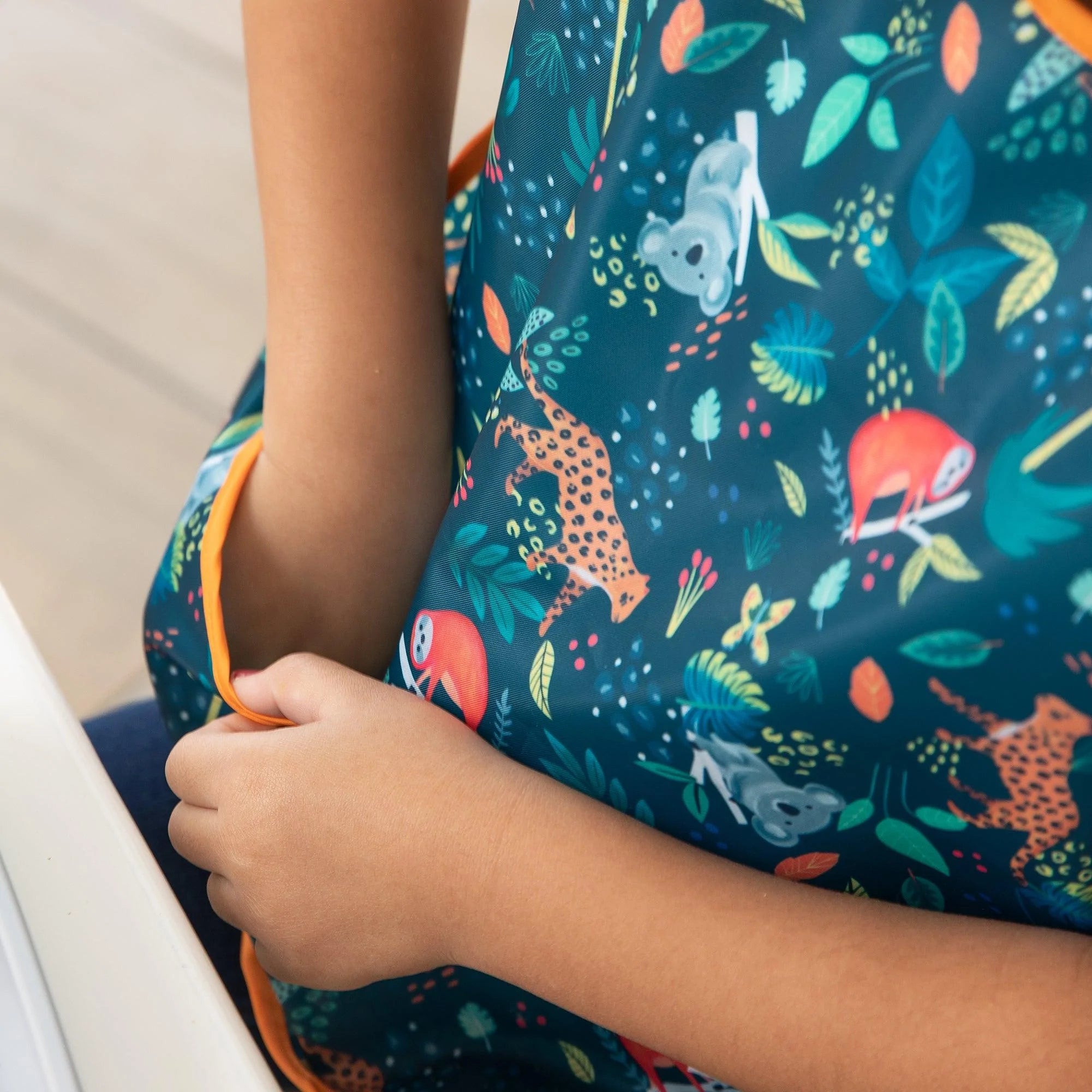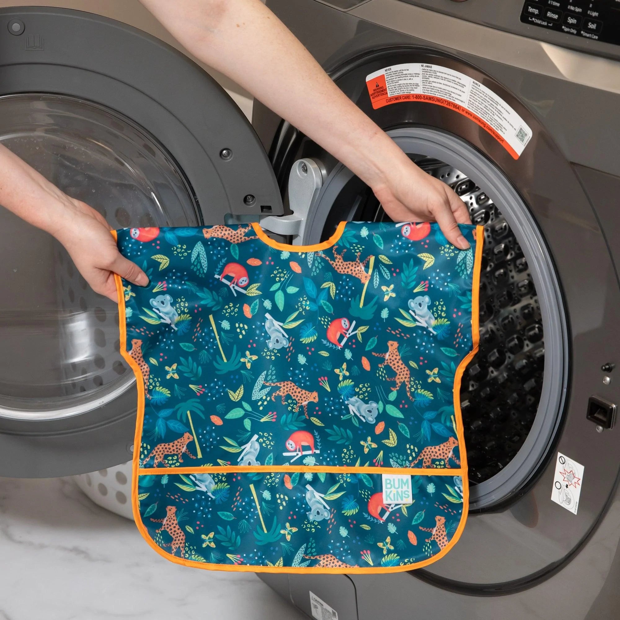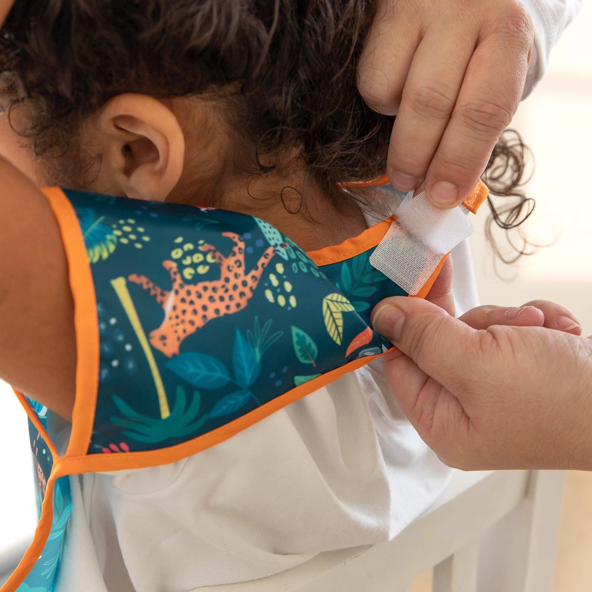 Your child won’t realize they’re wearing a bib as they slip on this short-sleeved toddler bib that features a large catch-all pocket to help contain spills, crumbs, and more. The back hook-and-loop closure allows for a quick, adjustable, and tug-proof fit. Wipeable and machine washable for easy cleaning so you can use it over and over again!