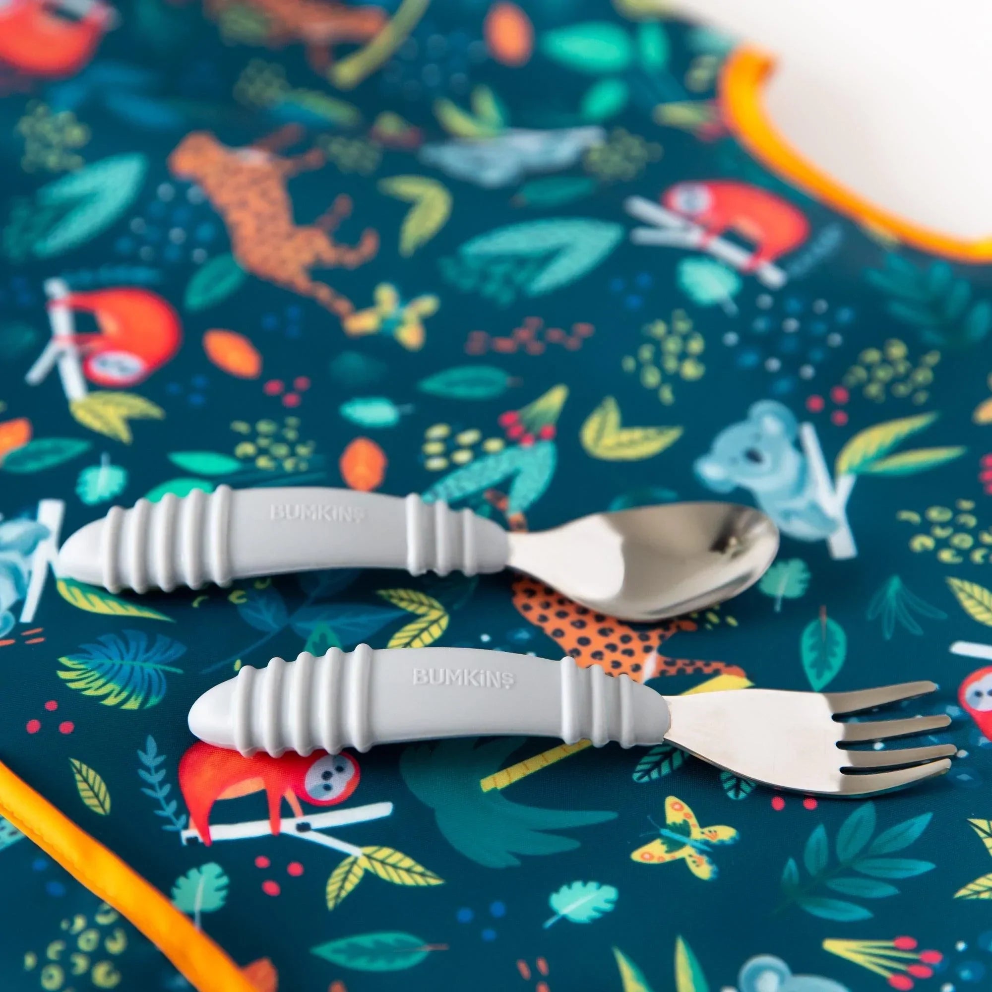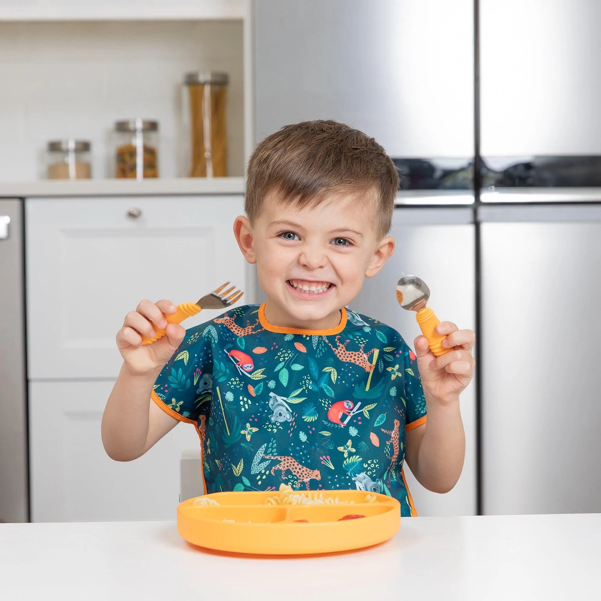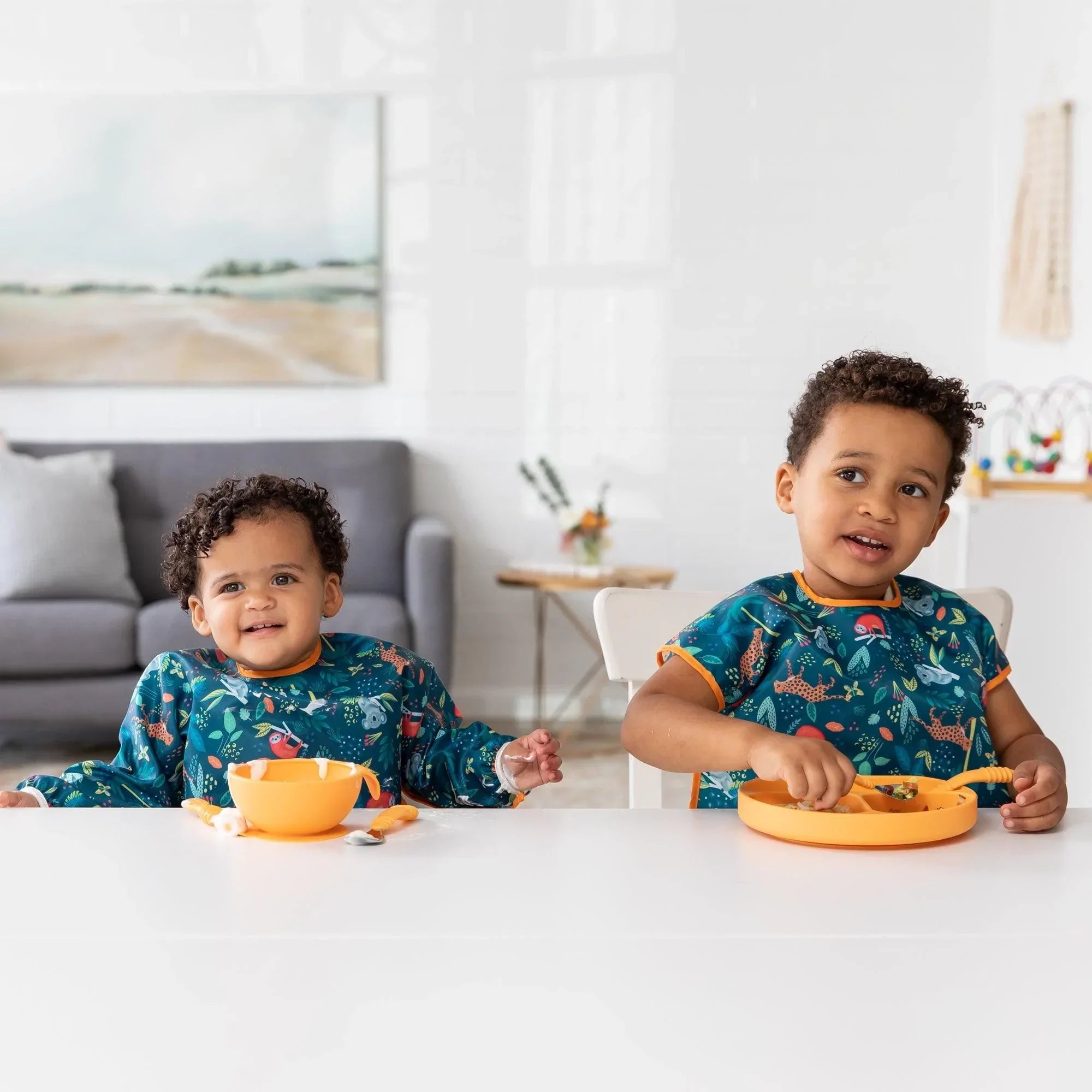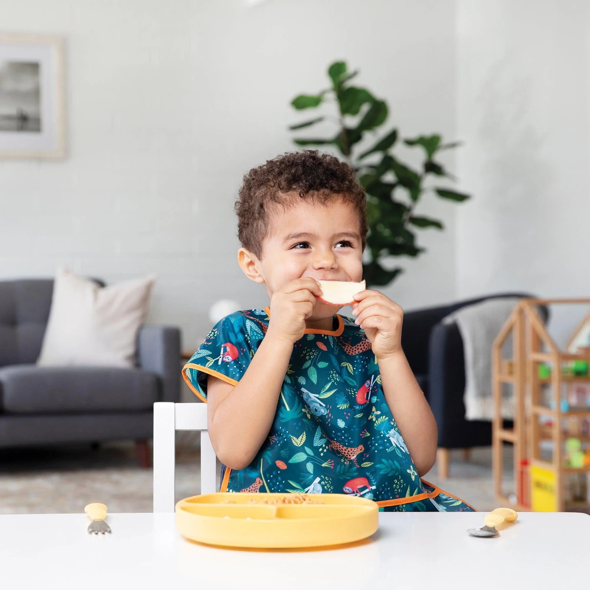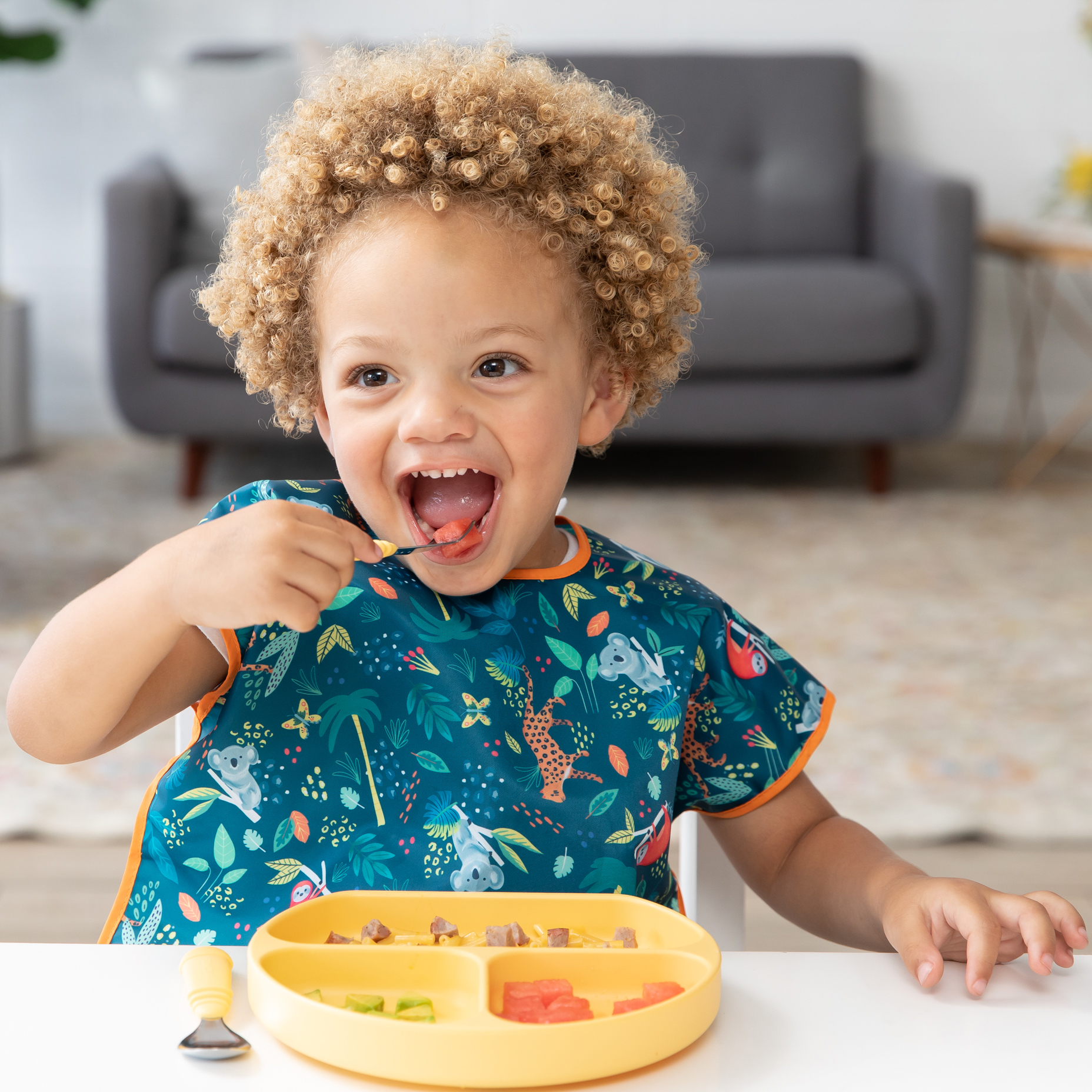 Your child won’t realize they’re wearing a bib as they slip on this short-sleeved toddler bib that features a large catch-all pocket to help contain spills, crumbs, and more. The back hook-and-loop closure allows for a quick, adjustable, and tug-proof fit. Wipeable and machine washable for easy cleaning so you can use it over and over again!