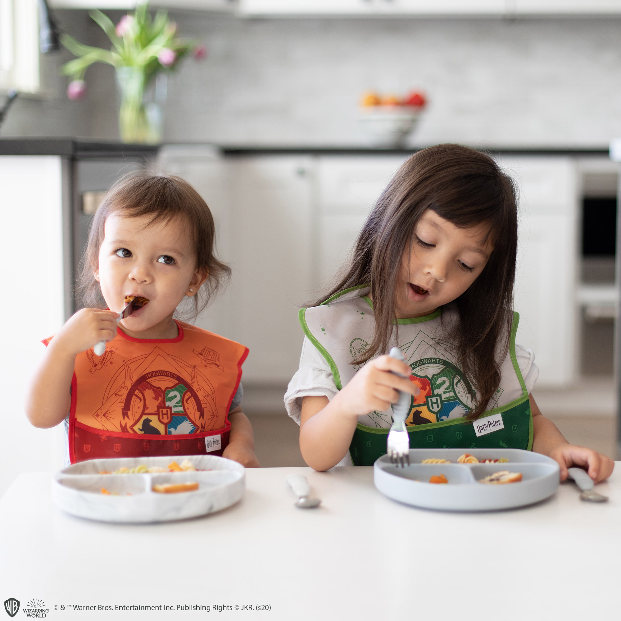 Our SuperBibs save you from the mess! The SuperBib attaches over the back of the shoulder with hook and loop closure for a quick, adjustable and tug-proof fit. With a handy crumb catcher / catch-all pocket for containing spills. Made from Bumkins lightweight, waterproof, easy-wipe, stain and odor resistant fabric. Single ply construction means no worrying about icky stuff growing between layers of fabric. Without a cotton layer, stains and smells don't stick. Wipeable and machine washable for easy cleaning so you can use it over and over again.