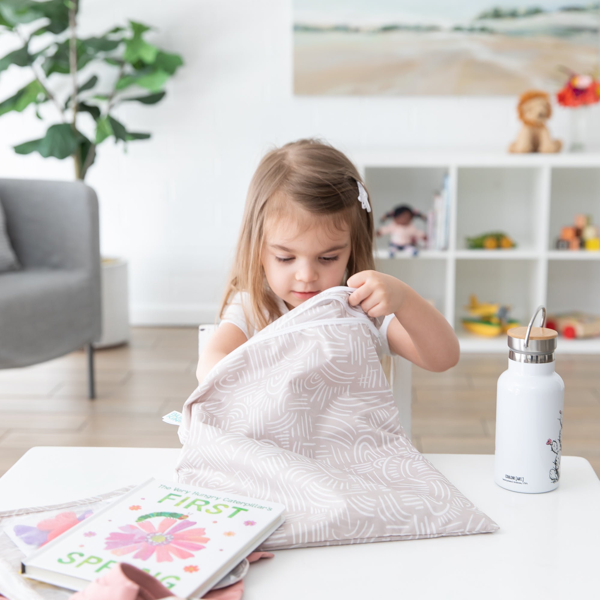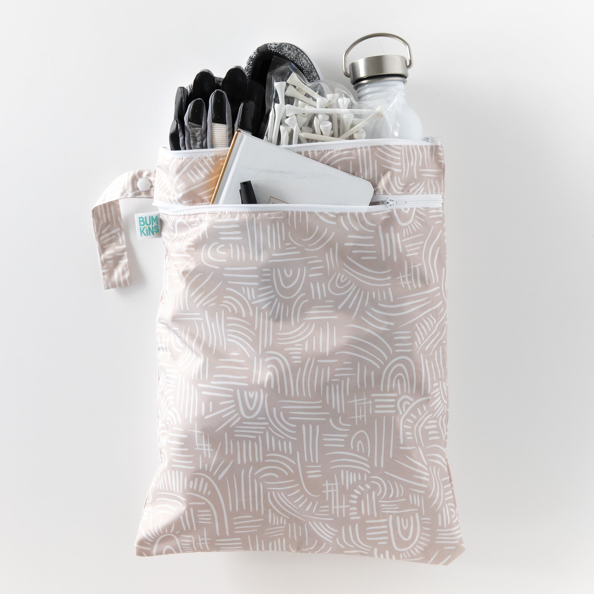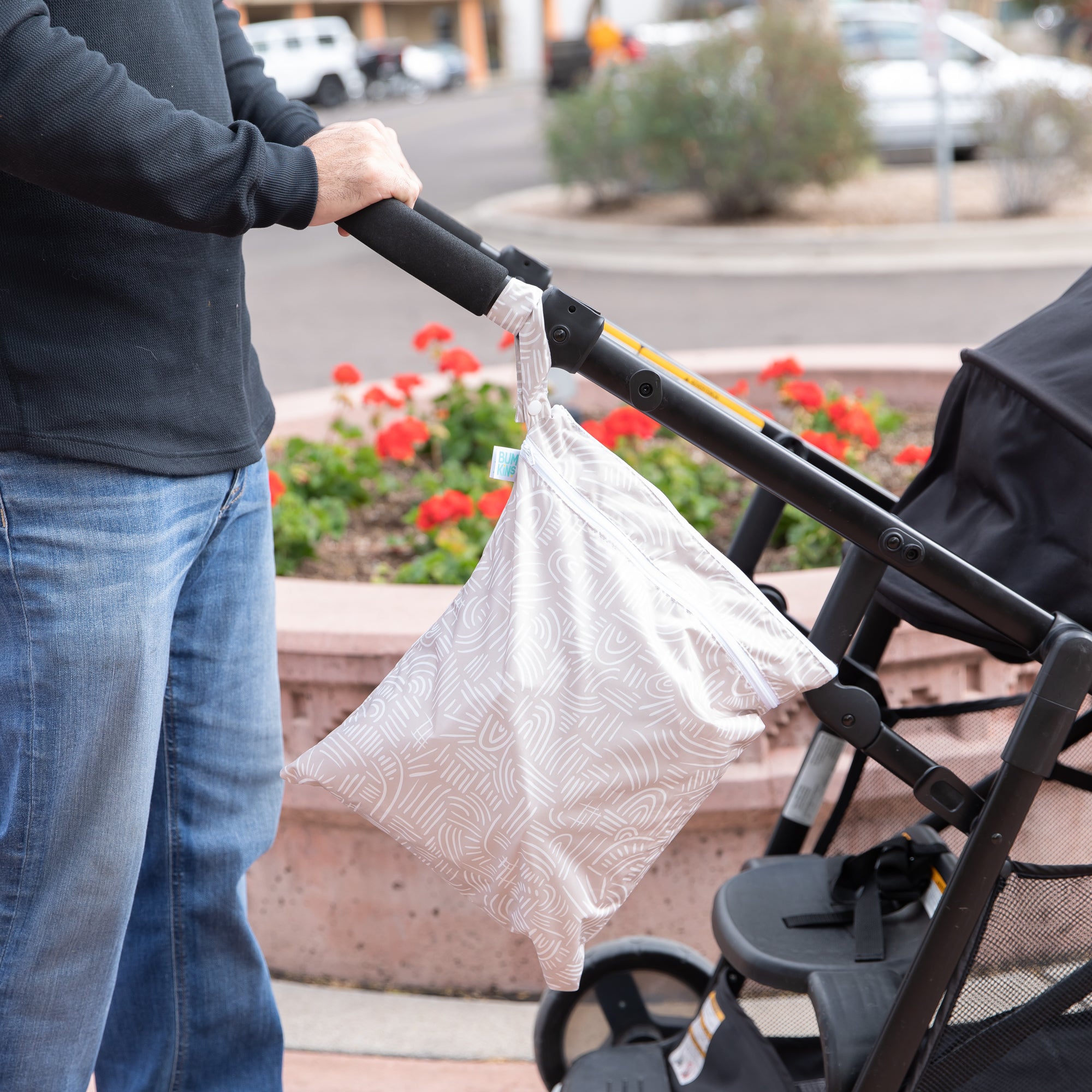 The better alternative to single-use plastic bags, our reusable Wet / Dry Bags are made from the same waterproof fabric as our SuperBib. Our bags feature heat-sealed seams for true waterproof protection. Two compartments with smooth zippered closures keep wet and dry items separate. Single-ply construction means no worrying about icky stuff growing between layers of fabric. Wet / Dry bags are great for carrying diapers, dirty gym clothes and wet swimsuits. These bags make excellent organizers for toys, accessories, toiletries, electronics, travel and more! With a snap handle, snap your bag wherever you need it – stroller, changing table or suitcase. Bags are non-gusseted, non-insulated and non-stretch.