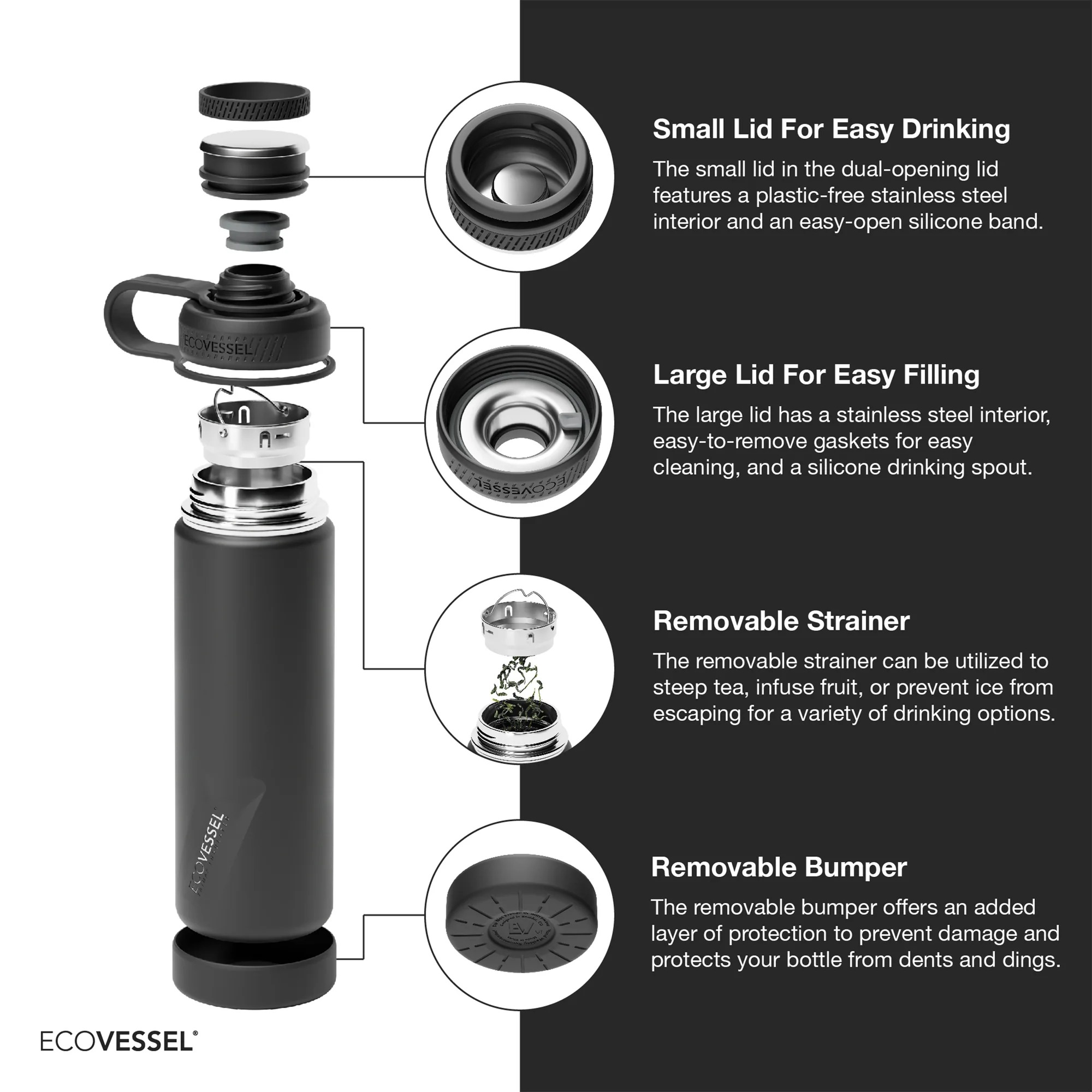 De Boulder is gemaakt voor alle avonturen in het leven - gemakkelijk mee te nemen, te drinken en te vullen. Je kunt erop vertrouwen dat hij drankjes tot 60 uur koud of tot 12 uur warm houdt. Deze fles valt op door de uitneembare zeef, perfect voor fruit, thee of ijs, een beschermende siliconen stootrand en een stevige draagriem. Blijf gehydrateerd!