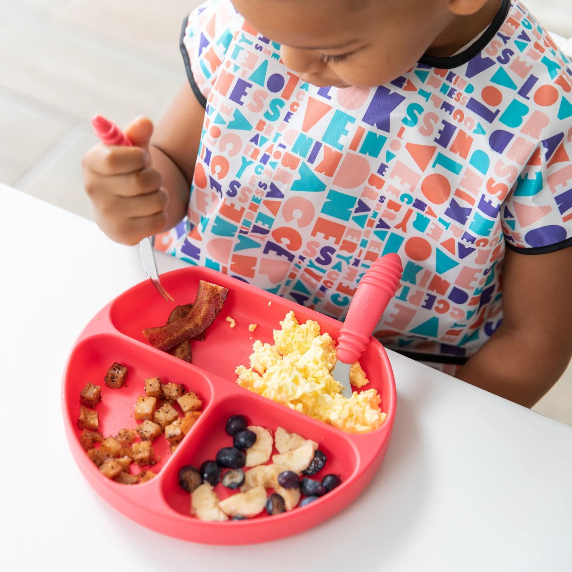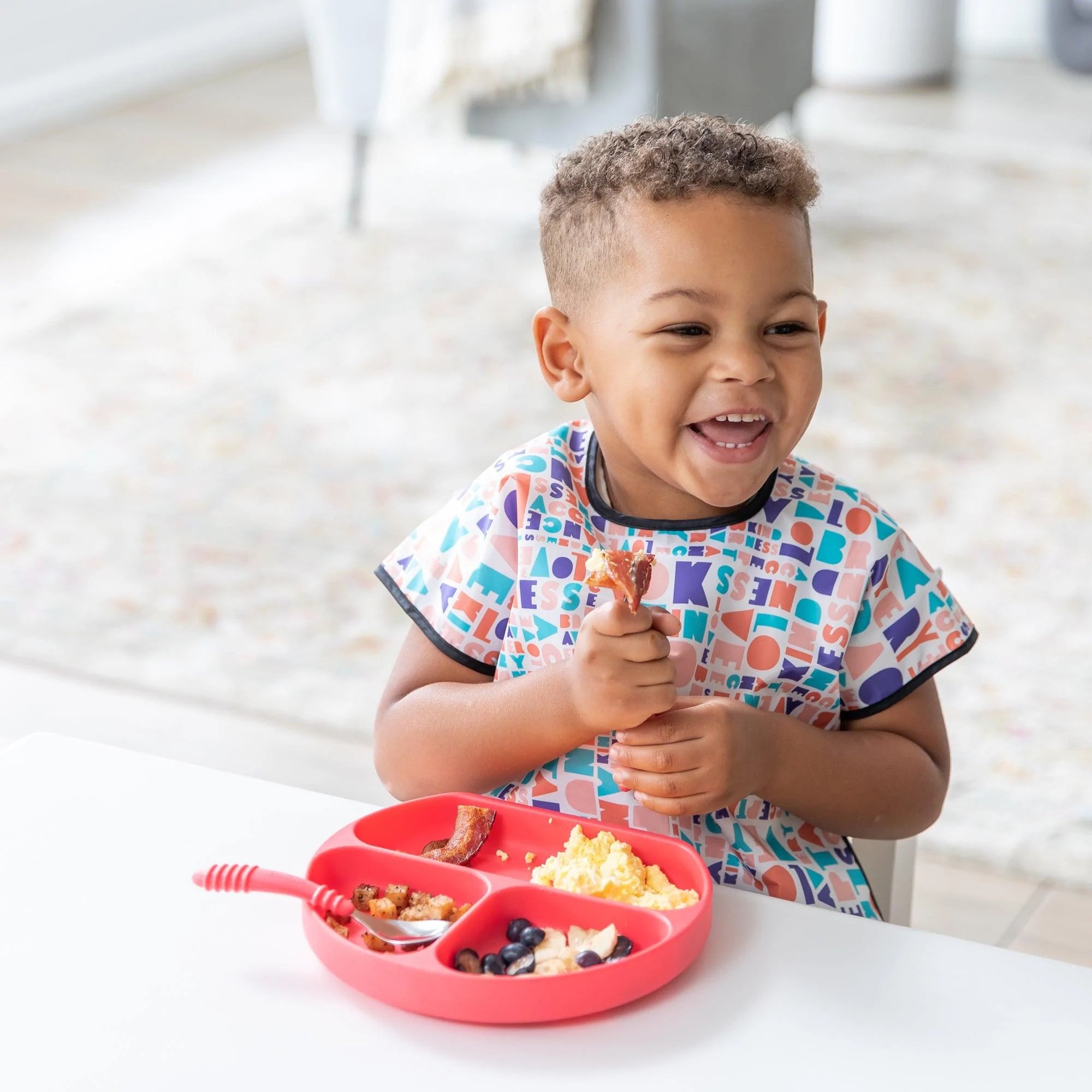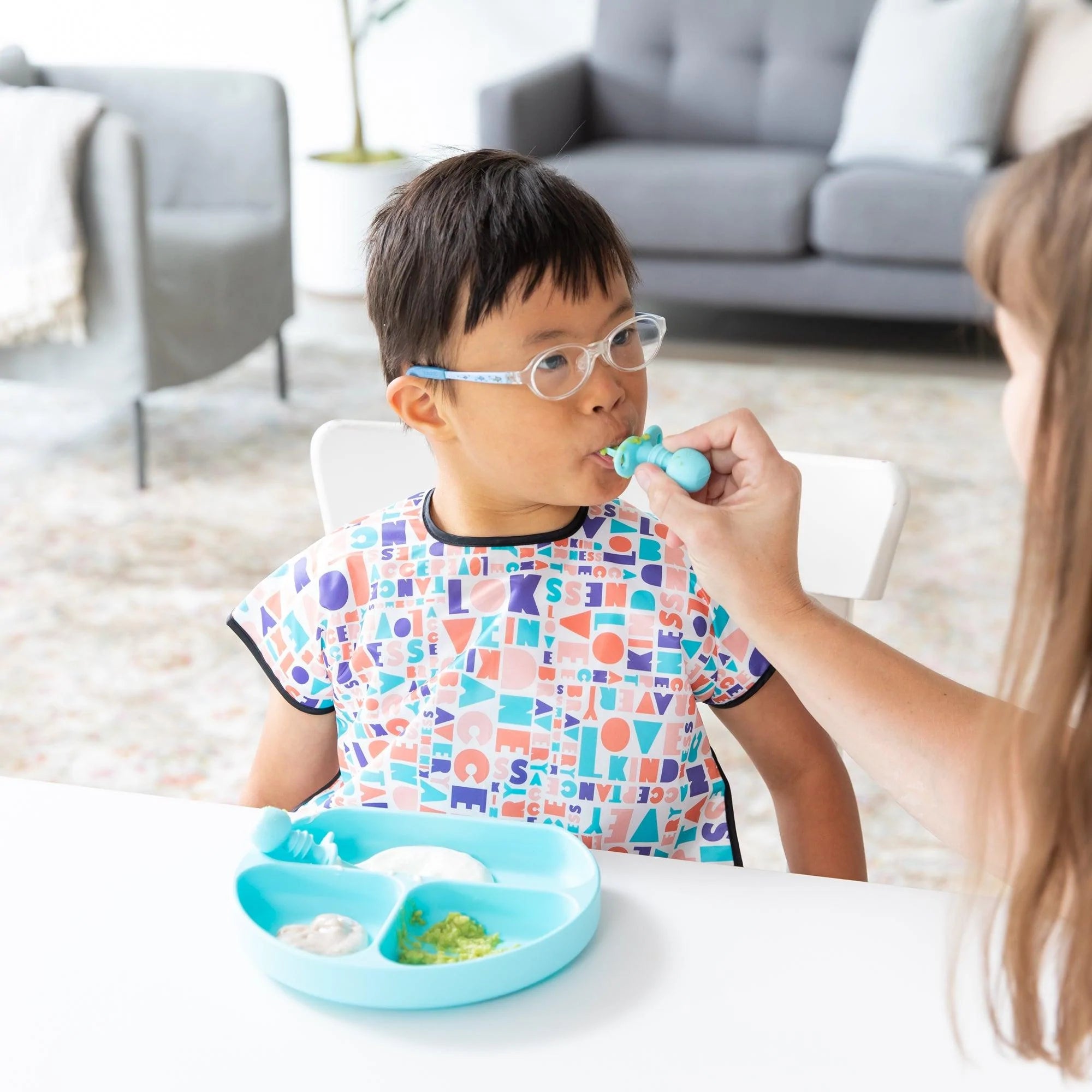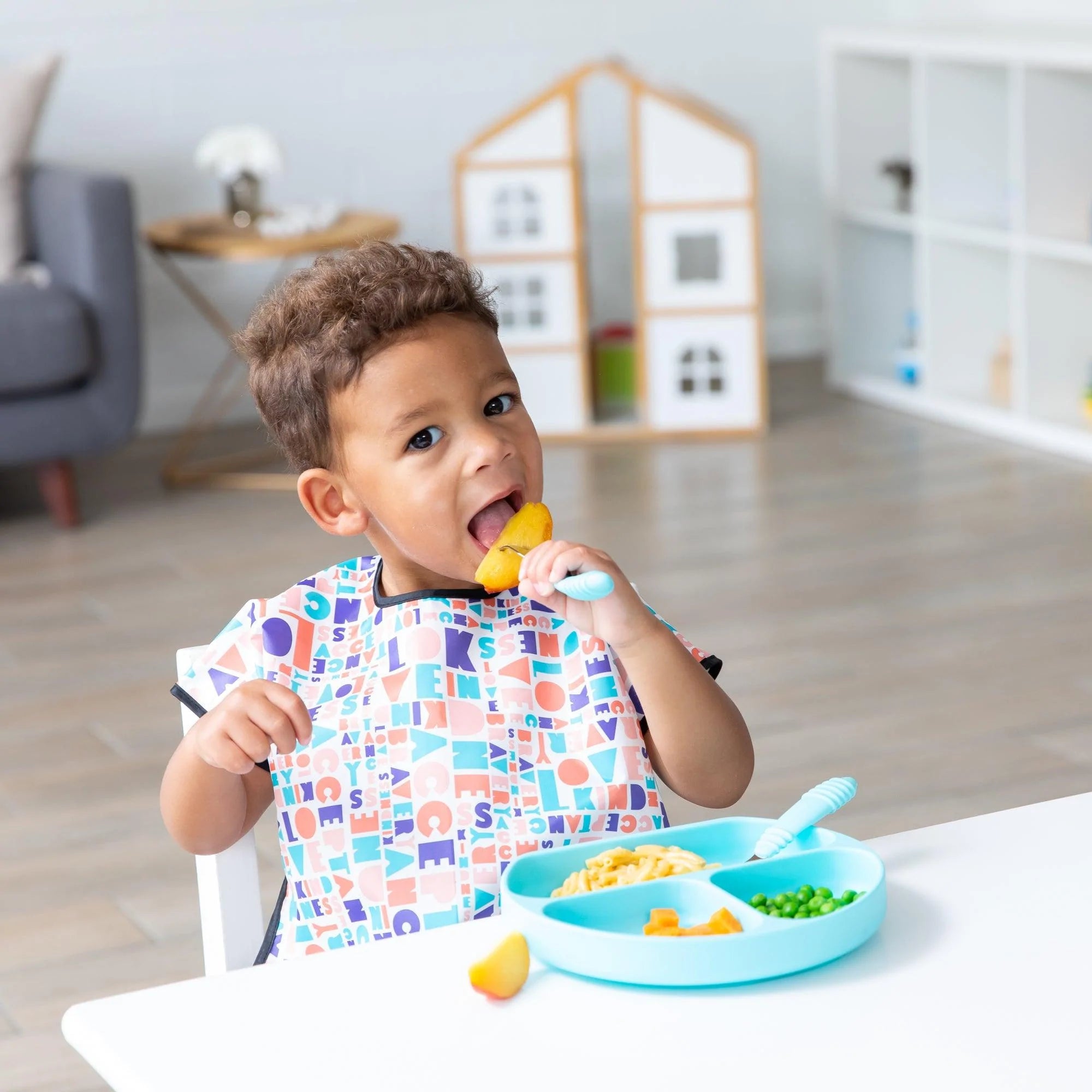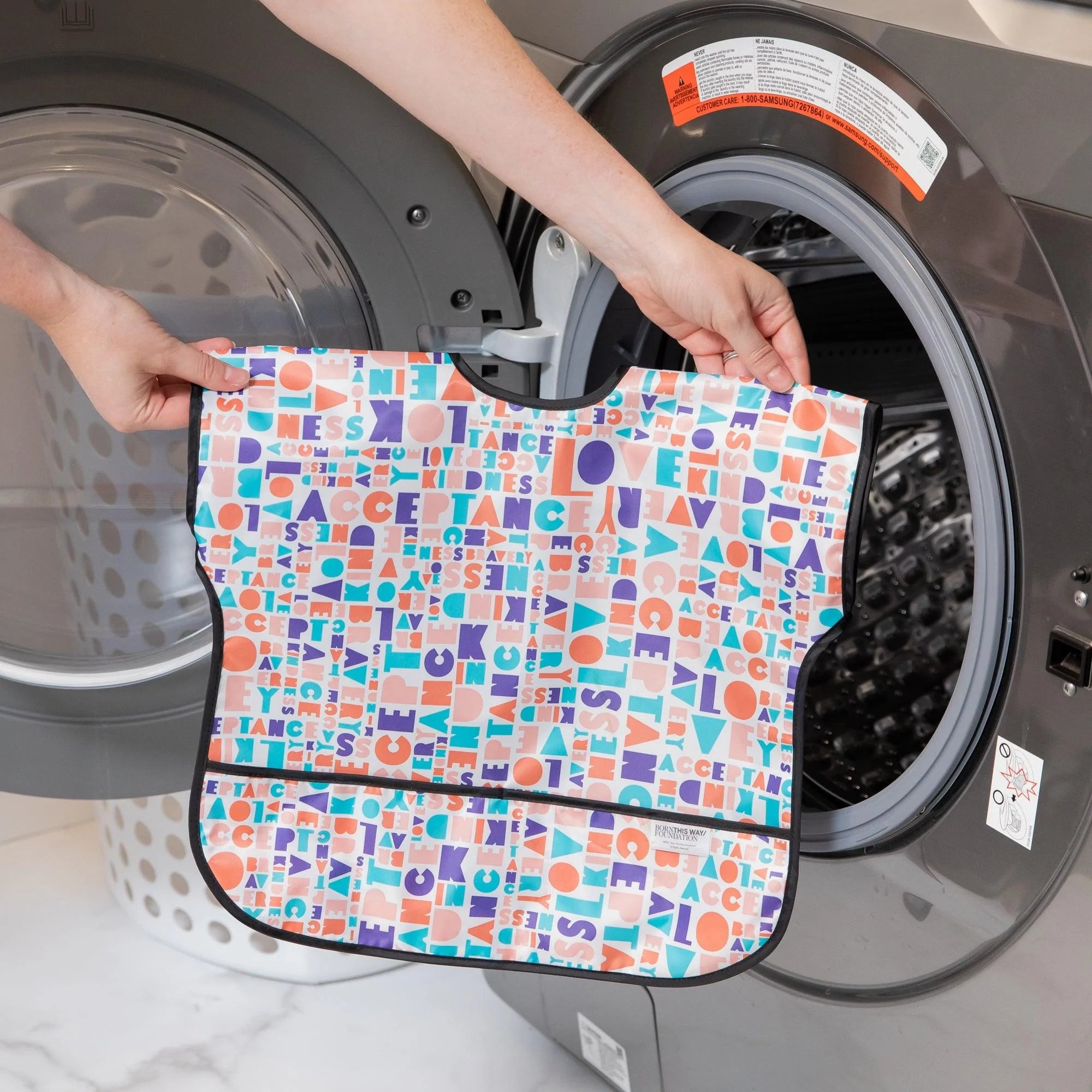 Je kind zal niet doorhebben dat het een slabbetje draagt als het deze junior slab met korte mouwen aantrekt. Het heeft een opvangbakje om gemorst voedsel, kruimels en nog veel meer op te vangen. De klittenbandsluiting aan de achterkant zorgt voor een snelle, verstelbare en trek-proof pasvorm. Afveegbaar en machinewasbaar voor eenvoudig schoonmaken zodat je het keer op keer kunt gebruiken!