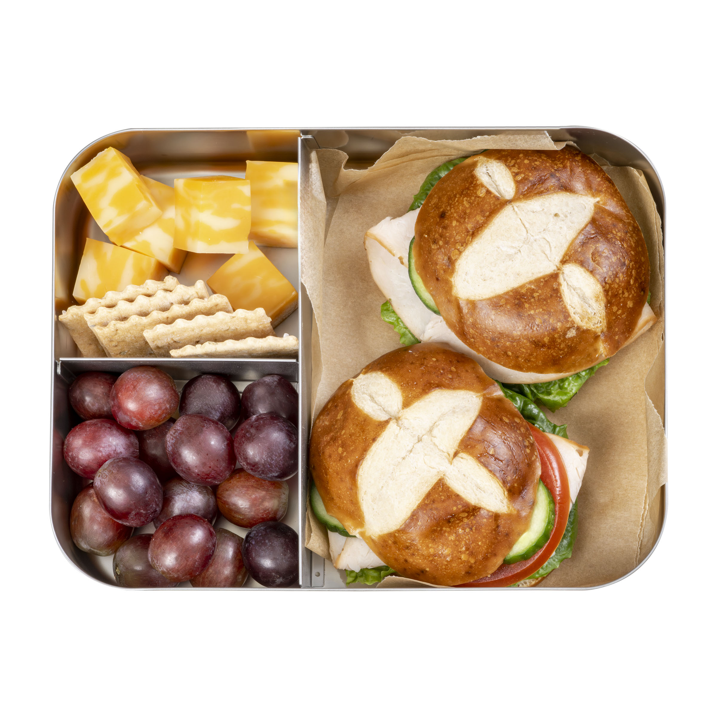 Deze ruime roestvrijstalen bentobox met 3 compartimenten is ontworpen voor een volledige sandwich en twee bijgerechten. Broodjesfans van alle leeftijden zijn dol op de Large Trio omdat er in deze ene verpakking genoeg ruimte is voor een hele lunch.