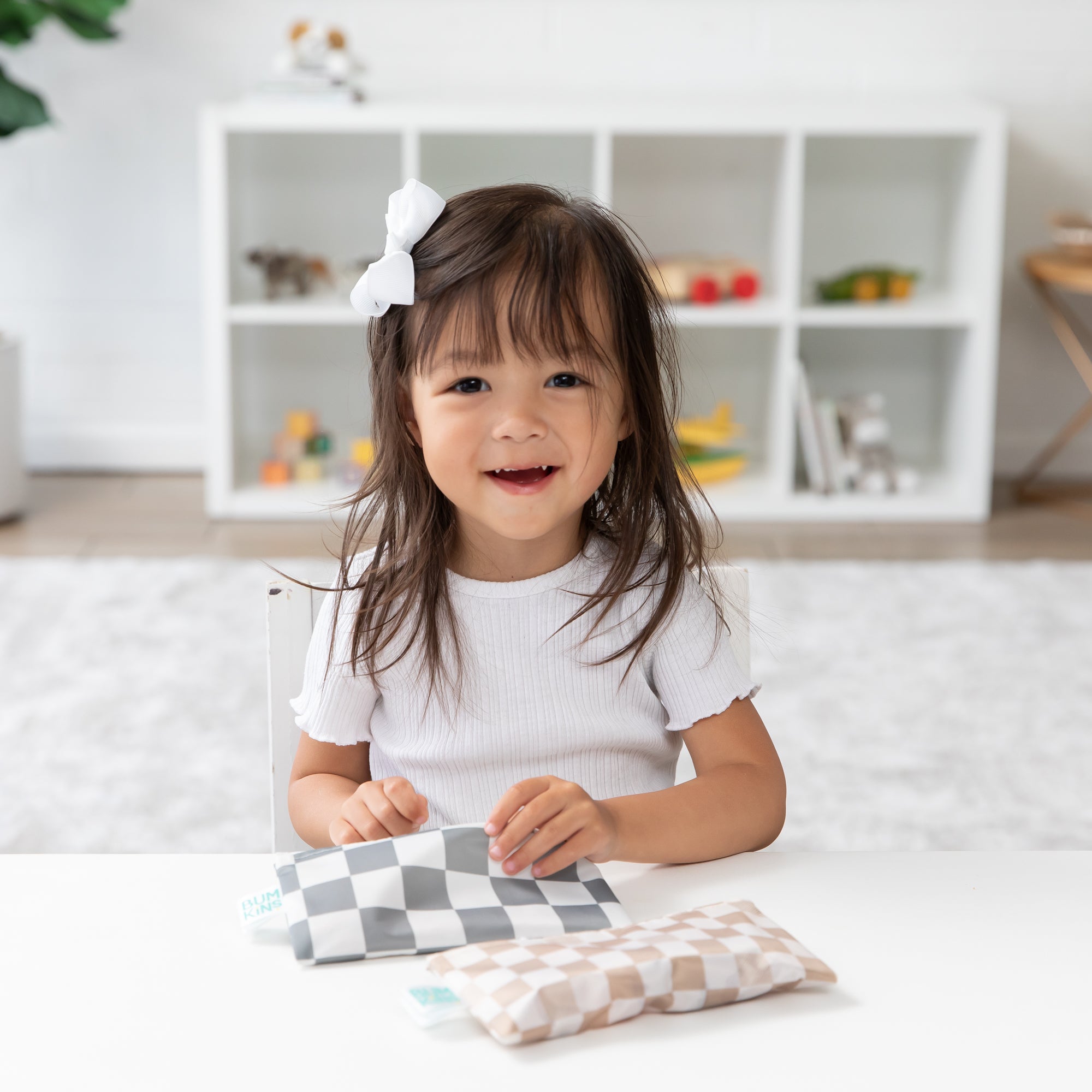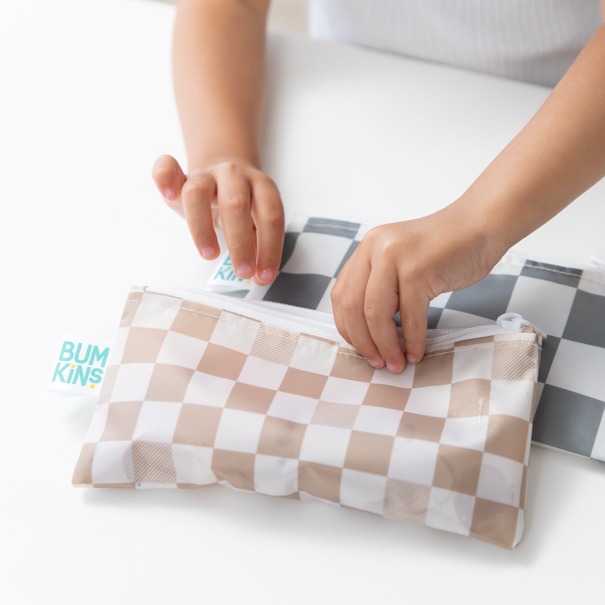 Onze herbruikbare snackzakjes zijn het betere alternatief voor plastic zakjes voor eenmalig gebruik en zijn gemaakt van dezelfde waterbestendige en vlekbestendige stof als onze SuperBib. Een soepele ritssluiting houdt geen kruimels vast en dankzij de eenlaagse constructie hoef je je geen zorgen te maken over vieze dingen die tussen de lagen stof groeien. Niet alleen voor eten. Snackzakjes zijn uitstekende organizers voor opslag en reizen! Opbergen in je handtas, luiertas of reistas. Ideaal voor fopspenen, cosmetica, geld, elektronica en meer.
