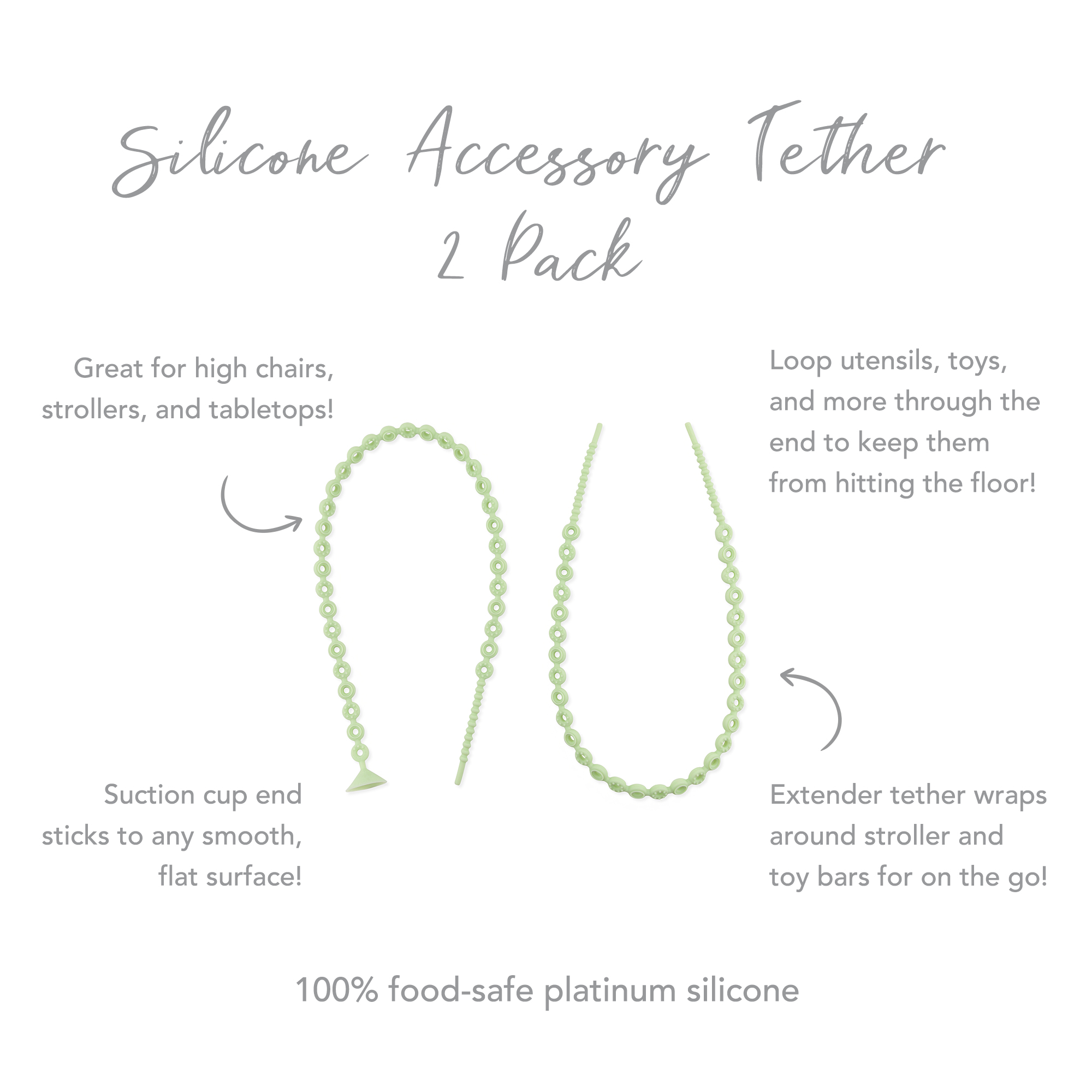 When excited littles lose their grip on utensils, sippy cups, and toys during mealtime, our handy silicone tether set keeps them within reach! One textured tether has a secure suction cup end, sticking to high chairs or tabletops, with the other end looping around feeding accessories. The additional extender tether is open-ended. You can attach it to the suction strap to secure more items during mealtime or wrap it around bases like stroller arms to keep track of pacifiers and other gadgets on the go. Plus, textured food-grade silicone is great for teething babies and sensory exploration!