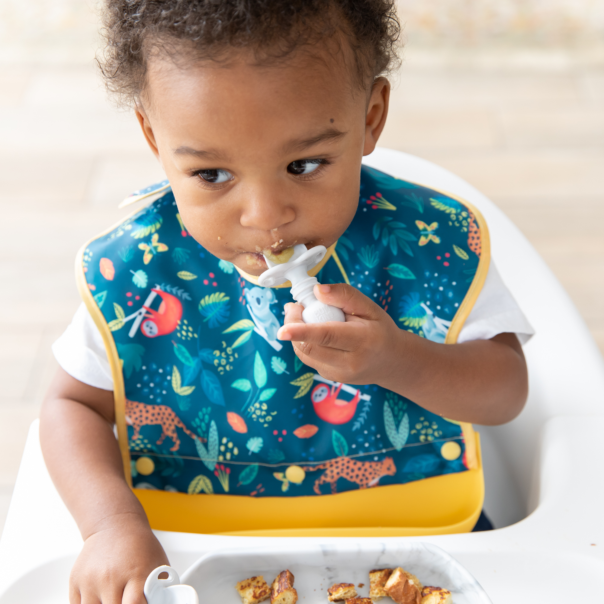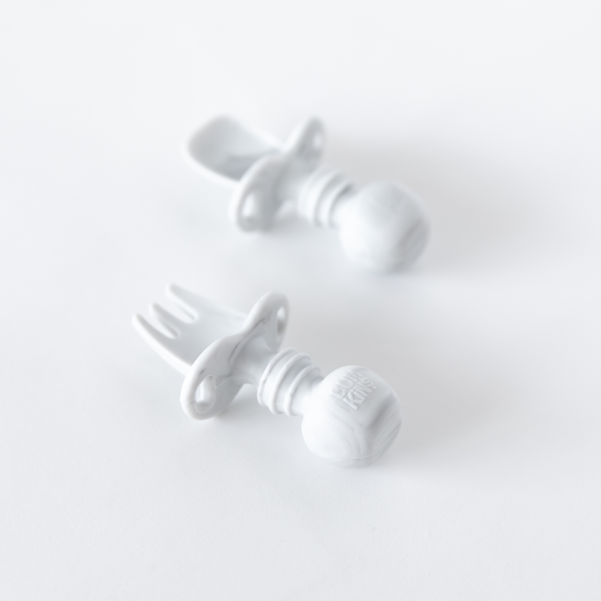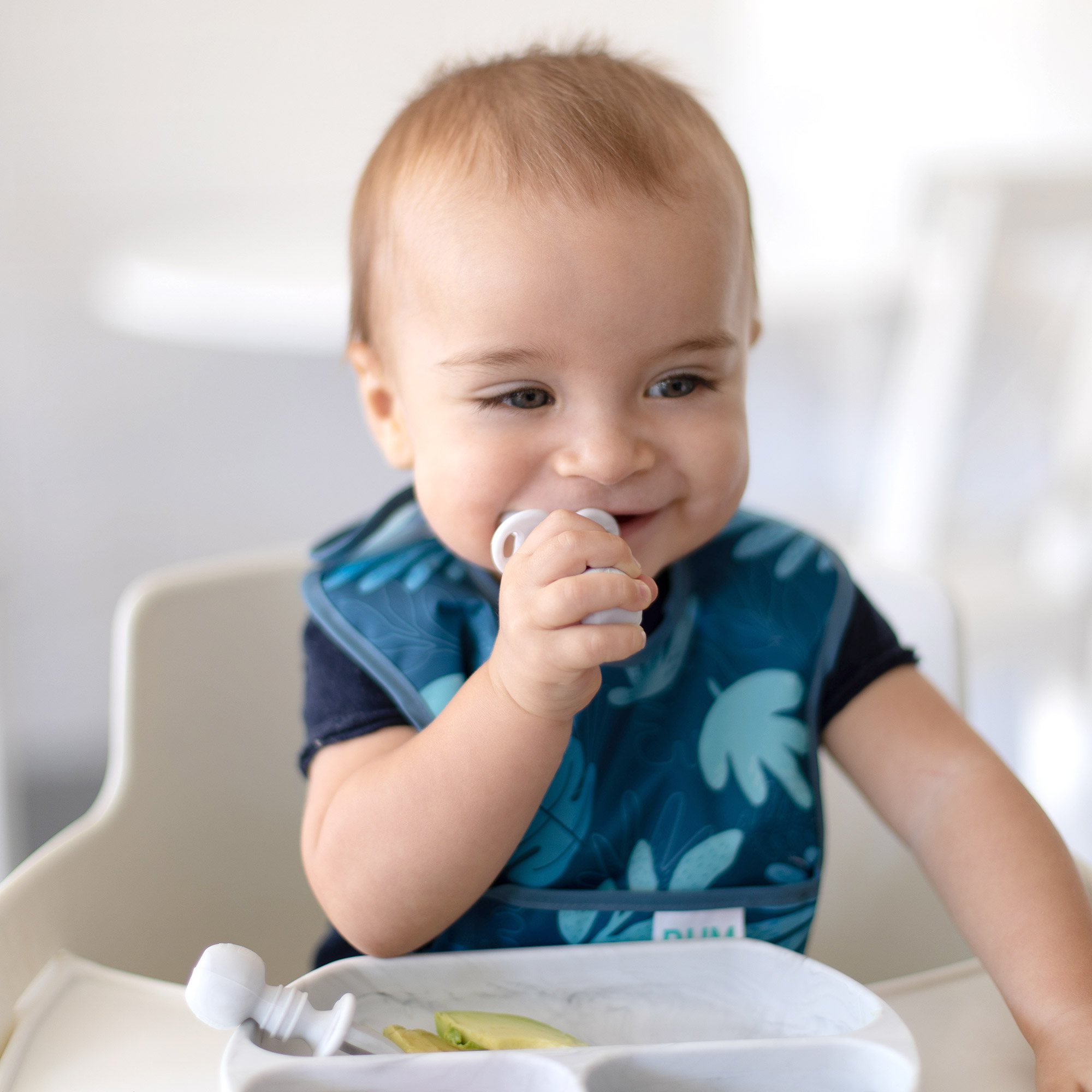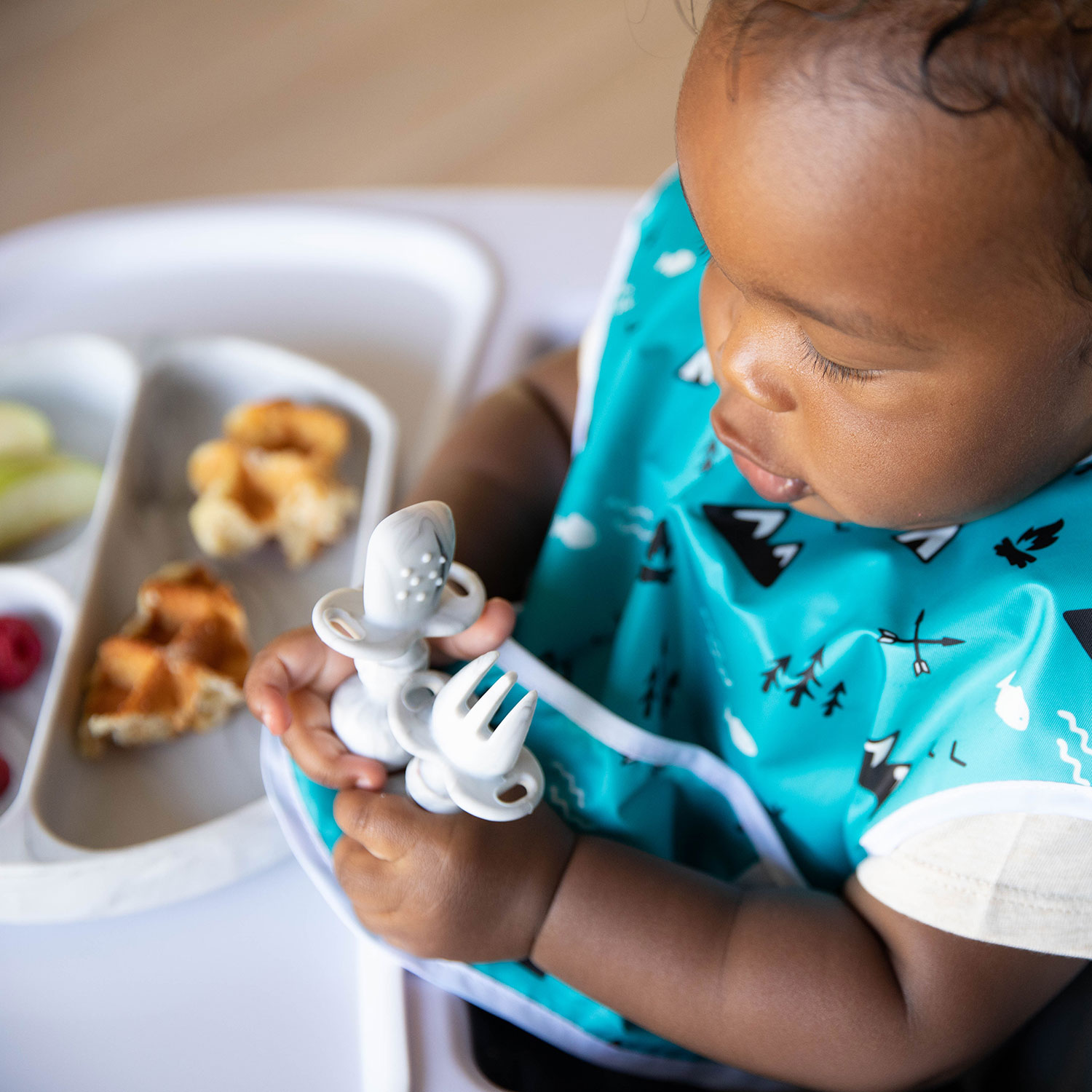 Ontworpen om baby's kennis laten maken met het concept van het vasthouden van bestek en zichzelf voeden. Zowel de lepel als de vork zijn gemaakt van zacht, gestructureerd, 100% voedselveilig platina siliconen dat makkelijk vast te pakken is en zacht voor gevoelig tandvlees, met buigbare koppen voor de veiligheid. De achterkant van de lepel heeft zintuiglijke bobbels om het tandvlees te stimuleren. Ze zijn perfect om in gepureerd voedsel te dopen in het begin van de babyfase. Ons bijtgerei is veilig en jongere baby's kunnen er zelfs op kauwen voordat ze klaar zijn voor zilverwerk.