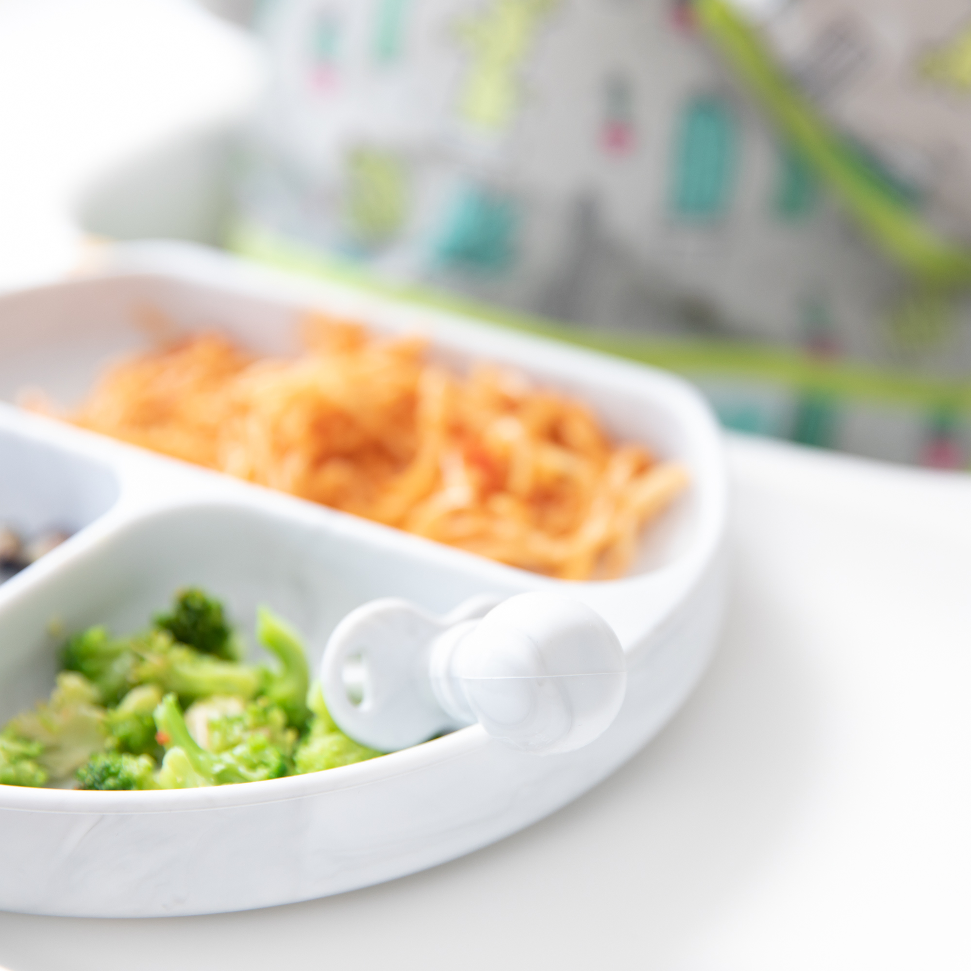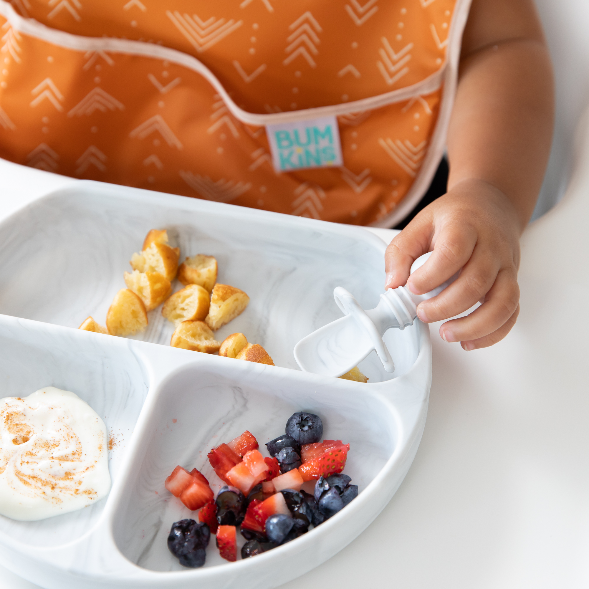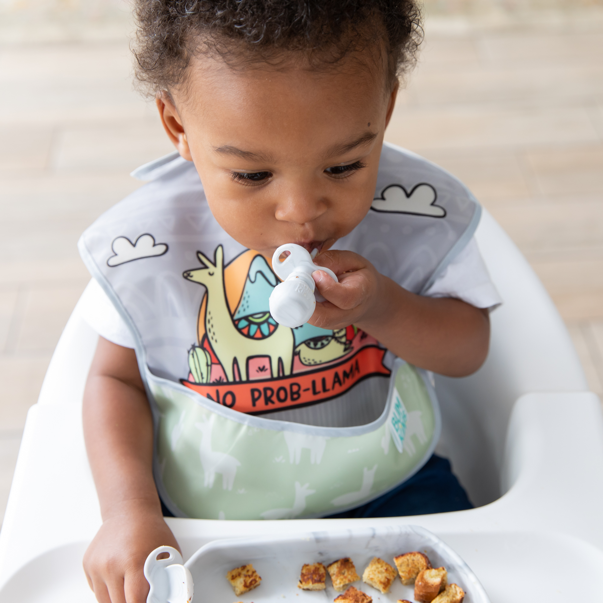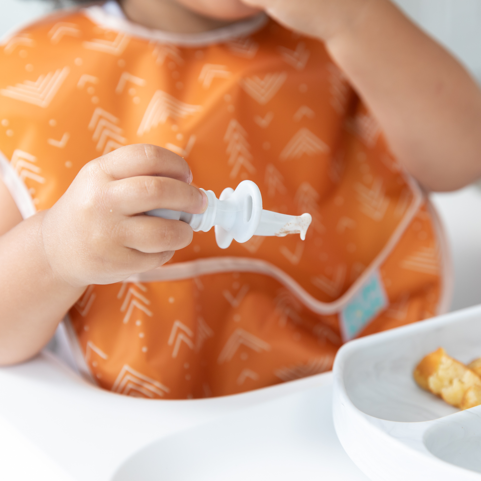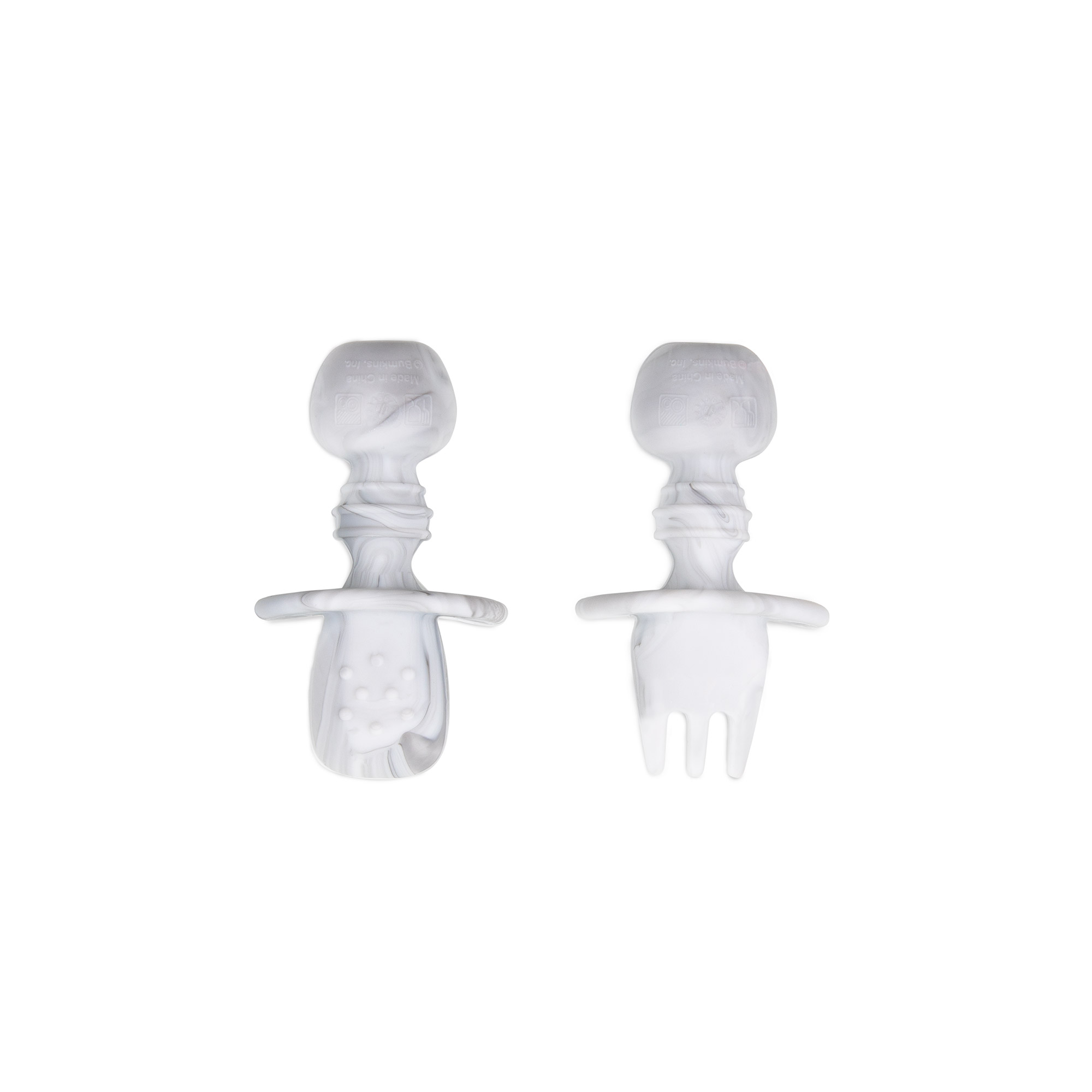 Ontworpen om baby's kennis laten maken met het concept van het vasthouden van bestek en zichzelf voeden. Zowel de lepel als de vork zijn gemaakt van zacht, gestructureerd, 100% voedselveilig platina siliconen dat makkelijk vast te pakken is en zacht voor gevoelig tandvlees, met buigbare koppen voor de veiligheid. De achterkant van de lepel heeft zintuiglijke bobbels om het tandvlees te stimuleren. Ze zijn perfect om in gepureerd voedsel te dopen in het begin van de babyfase. Ons bijtgerei is veilig en jongere baby's kunnen er zelfs op kauwen voordat ze klaar zijn voor zilverwerk.