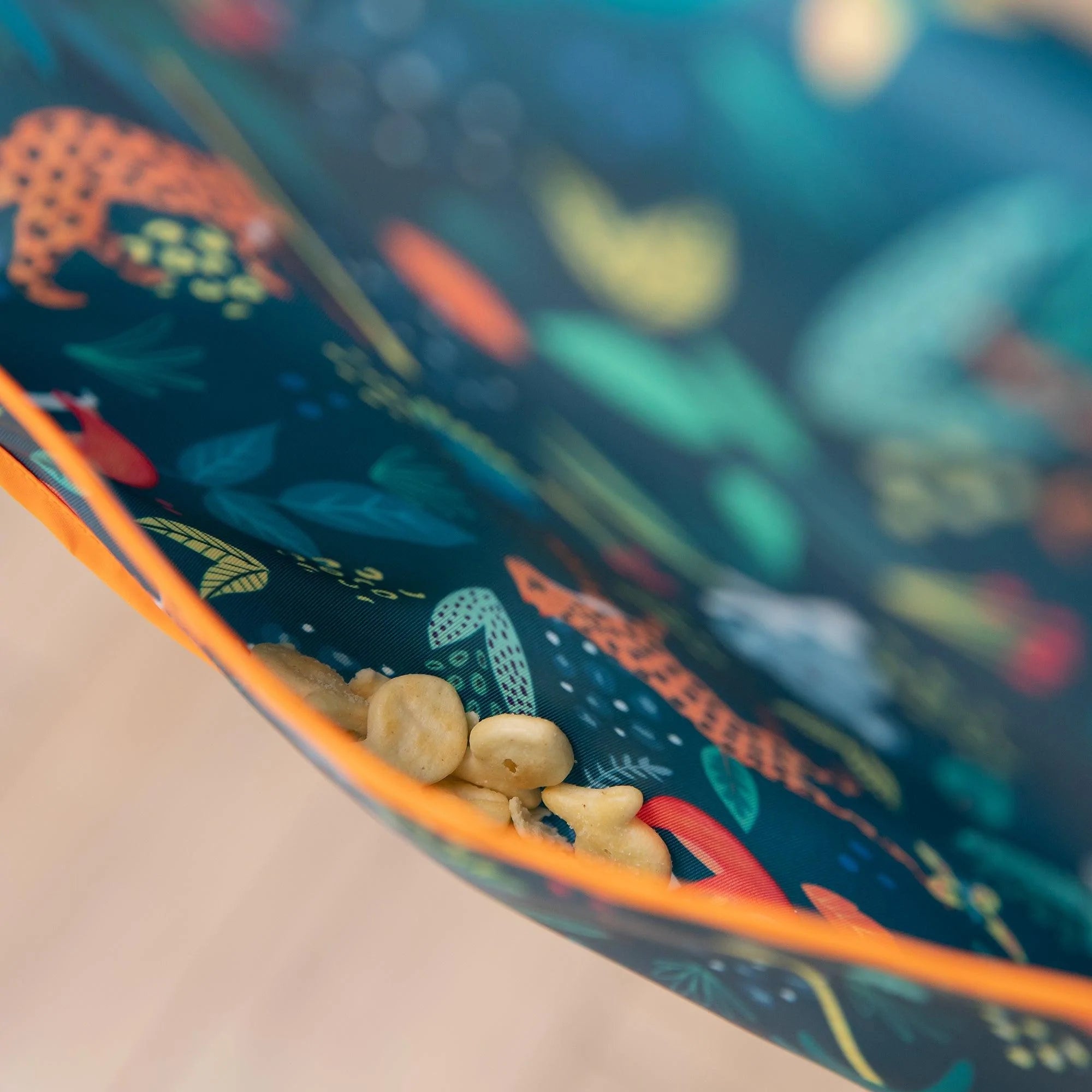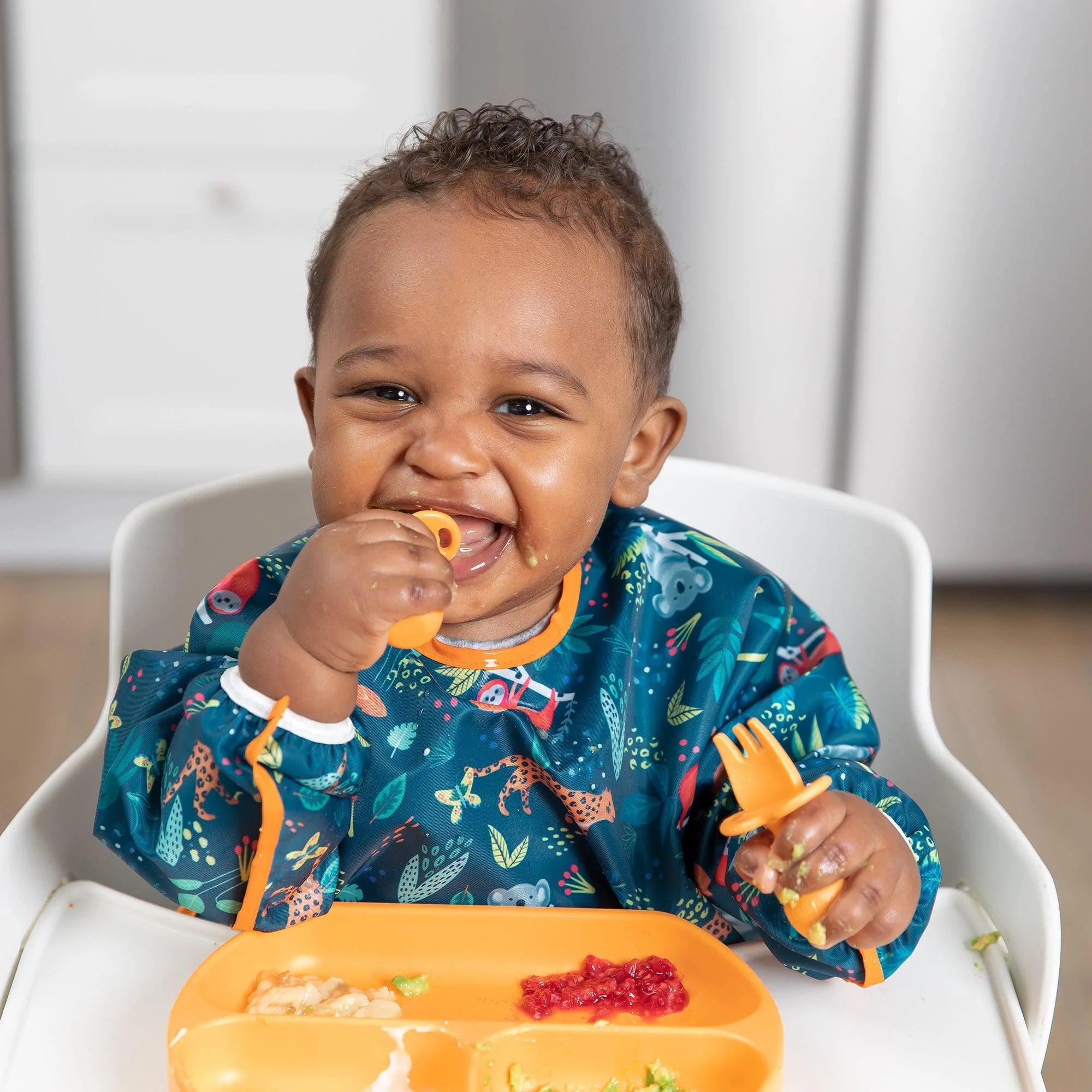 Het slabbetje met mouw is ruim bemeten en ideaal voor babyvoeding. Het is gemaakt van de lichtgewicht, duurzame, waterbestendige stof van Bumkins die vlekken en geurtjes tegengaat. Met maar één laag stof hoef je je geen zorgen te maken dat er vieze dingen tussen de lagen groeien. Pas de pasvorm aan je kleintje aan met een striksluiting aan de achterkant en elastische manchetten. Een groot opvangbakje helpt morsen, kruimels en nog veel meer op te vangen. Afveegbaar en machinewasbaar voor eenvoudig schoonmaken, zodat je hem keer op keer kunt gebruiken!
