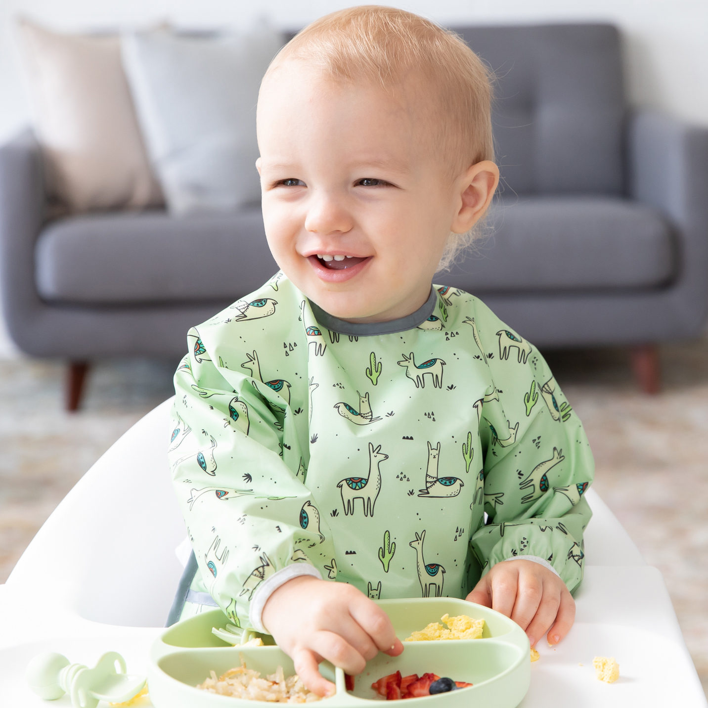 Het slabbetje met mouw is ruim bemeten en ideaal voor babyvoeding. Het is gemaakt van de lichtgewicht, duurzame, waterbestendige stof van Bumkins die vlekken en geurtjes tegengaat. Met maar één laag stof hoef je je geen zorgen te maken dat er vieze dingen tussen de lagen groeien. Pas de pasvorm aan je kleintje aan met een striksluiting aan de achterkant en elastische manchetten. Een groot opvangbakje helpt morsen, kruimels en nog veel meer op te vangen. Afveegbaar en machinewasbaar voor eenvoudig schoonmaken, zodat je hem keer op keer kunt gebruiken!