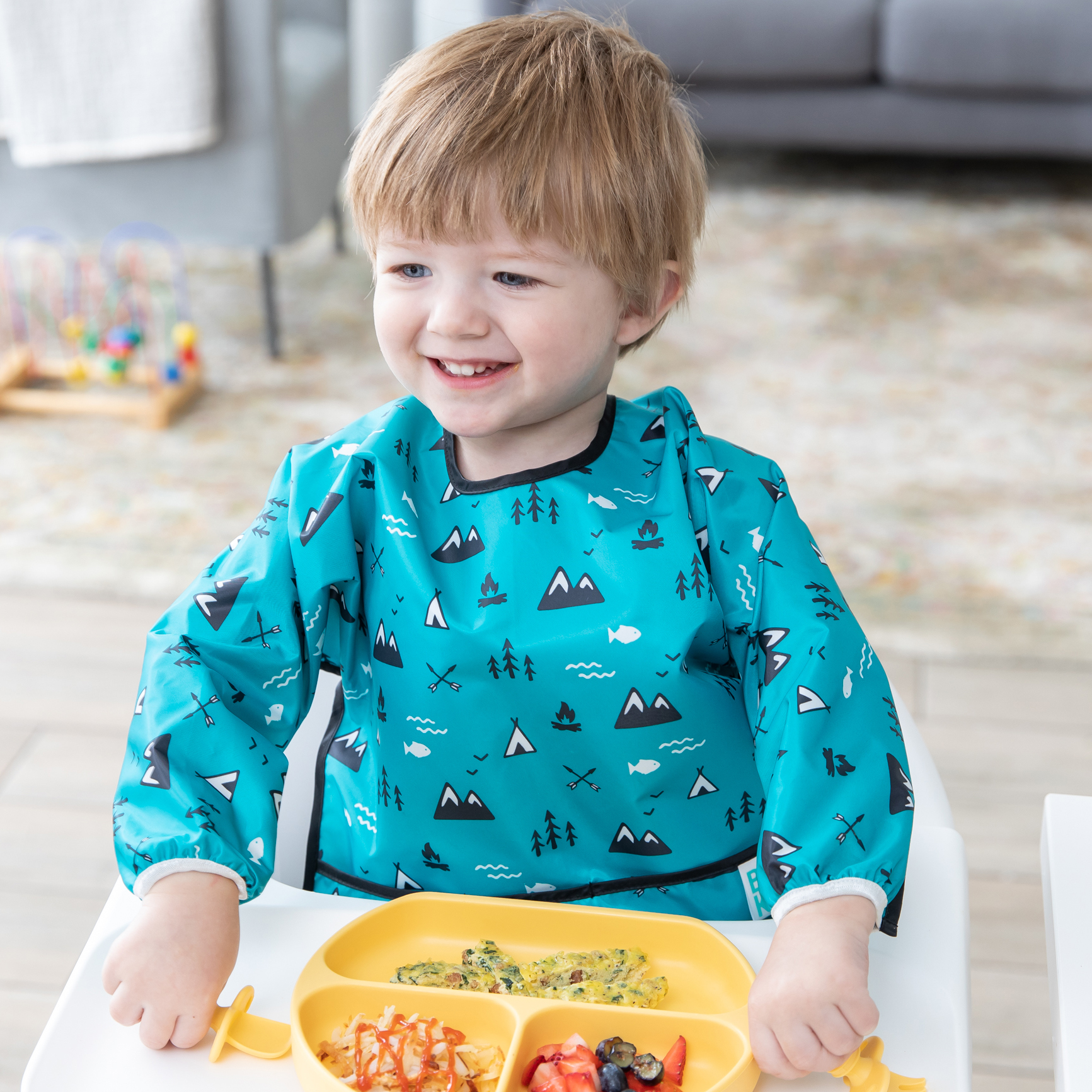 Het slabbetje met mouw is ruim bemeten en ideaal voor babyvoeding. Het is gemaakt van de lichtgewicht, duurzame, waterbestendige stof van Bumkins die vlekken en geurtjes tegengaat. Met maar één laag stof hoef je je geen zorgen te maken dat er vieze dingen tussen de lagen groeien. Pas de pasvorm aan je kleintje aan met een striksluiting aan de achterkant en elastische manchetten. Een groot opvangbakje helpt morsen, kruimels en nog veel meer op te vangen. Afveegbaar en machinewasbaar voor eenvoudig schoonmaken, zodat je hem keer op keer kunt gebruiken!