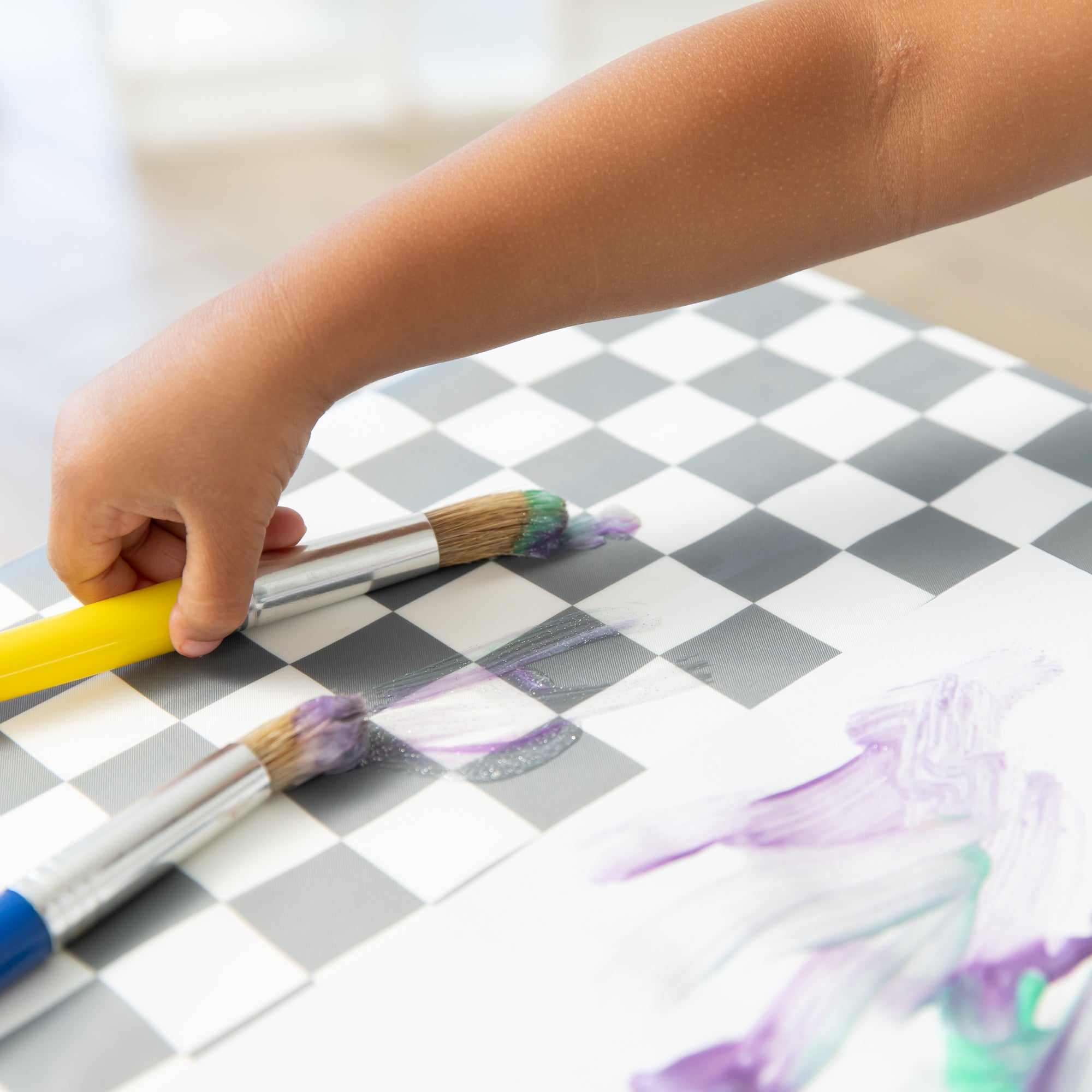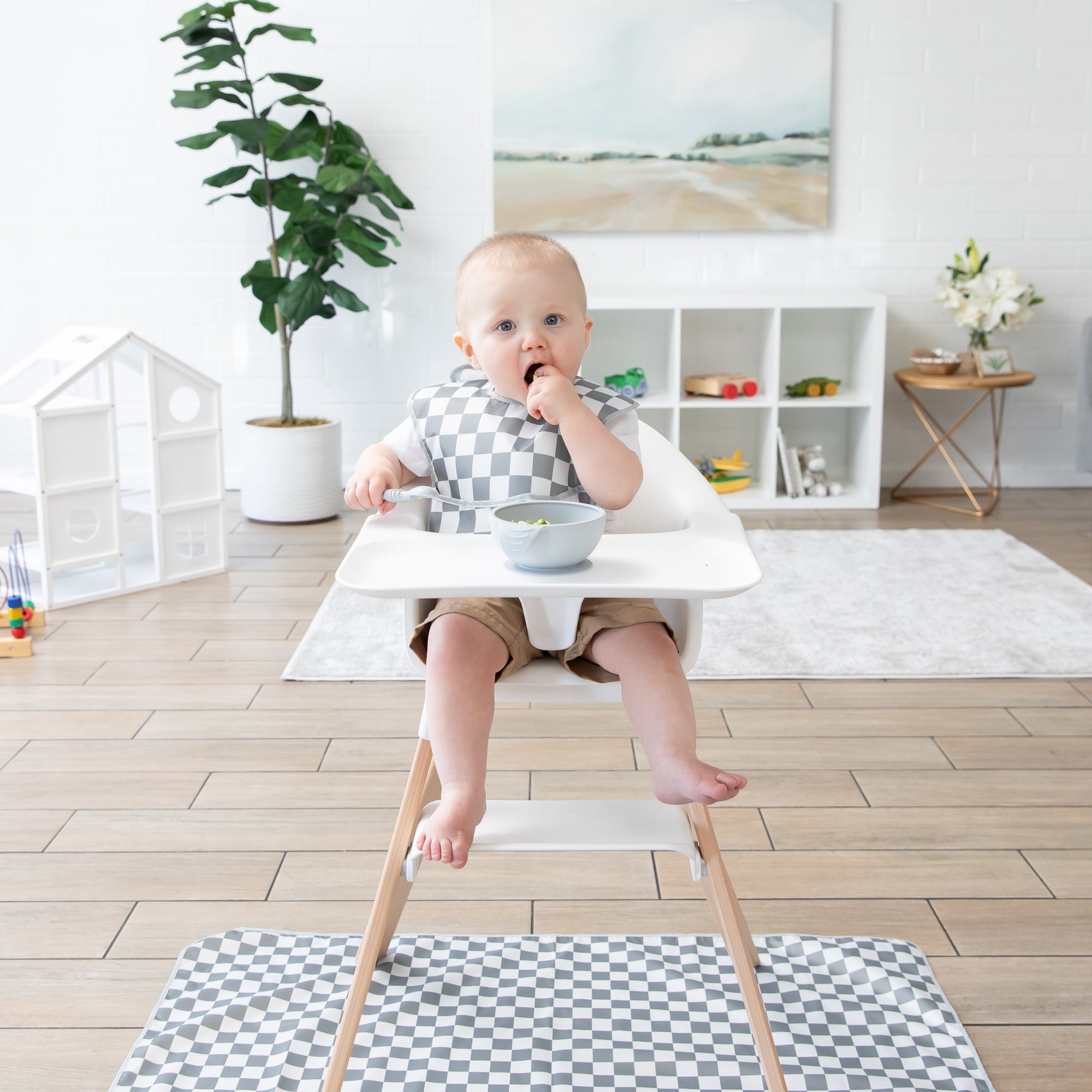 Zorg dat je kind geen rommel maakt met deze knoeimat die vloeren en tafelbladen schoon houdt! Onze knoeimatten zijn gemaakt om je vloeren en tafels te beschermen tegen geknoei tijdens het eten en geknoei tijdens het spelen. Niet alleen voor onder kinderstoelen. Gebruik het op vloeren, tafels of buiten. En geweldig voor kunstprojecten. Gemaakt van dezelfde water- en vlekbestendige stof als Bumkins' bekroonde SuperBib. Dankzij de eenlaagse constructie hoef je je geen zorgen te maken over vieze dingen die tussen de lagen stof groeien. De royale afmeting van 107 x 107 cm is licht van gewicht en neemt daardoor minder ruimte in beslag in je tas, dus je kunt hem meenemen waar je hem nodig hebt! Afveegbaar en wasbaar in de wasmachine, dus gemakkelijk schoon te maken en keer op keer te gebruiken!