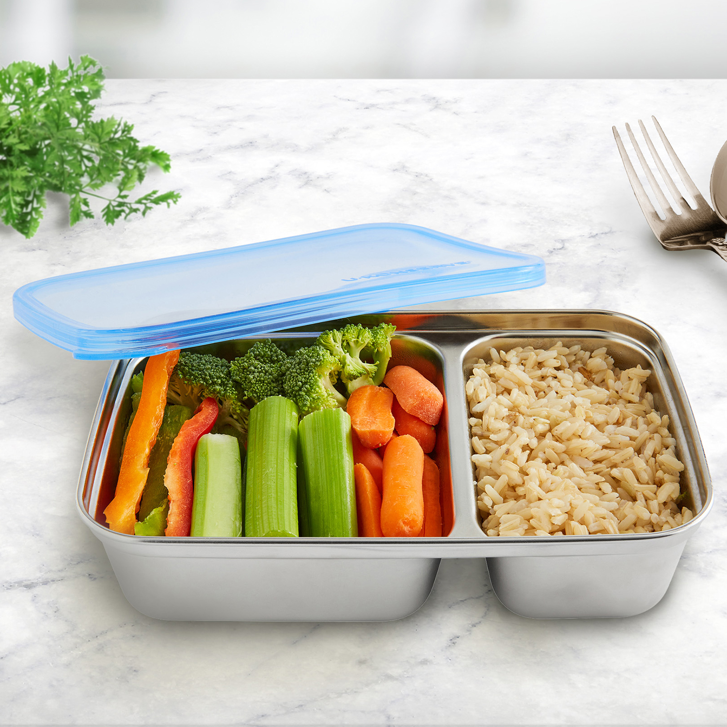 Onze roestvrijstalen verdeelde rechthoek is perfect voor het bereiden van maaltijden! Net als een traditionele bentobox is het gemakkelijk om eten te scheiden voor kieskeurige eters en ideaal om porties te controleren. Perfecte afvalvrije oplossing voor dagelijkse lunches, afhaalmaaltijden, picknicks, reizen, buitenavonturen, bulkboodschappen en saladbars. Verpak snacks, lunches en hoofdmaaltijden terwijl je verpakkingen voor eenmalig gebruik vermindert. Onze rechthoekige containers zijn ook ideaal voor keukenorganisatie, voorraadkast make-overs, maaltijdpreparatie en gezinsrestjes. Deze herbruikbare lunchbox is veelzijdig genoeg voor veel voedselopslagbehoeften thuis en onderweg, en bespaart afval van onze steeds groter wordende stortplaatsen.